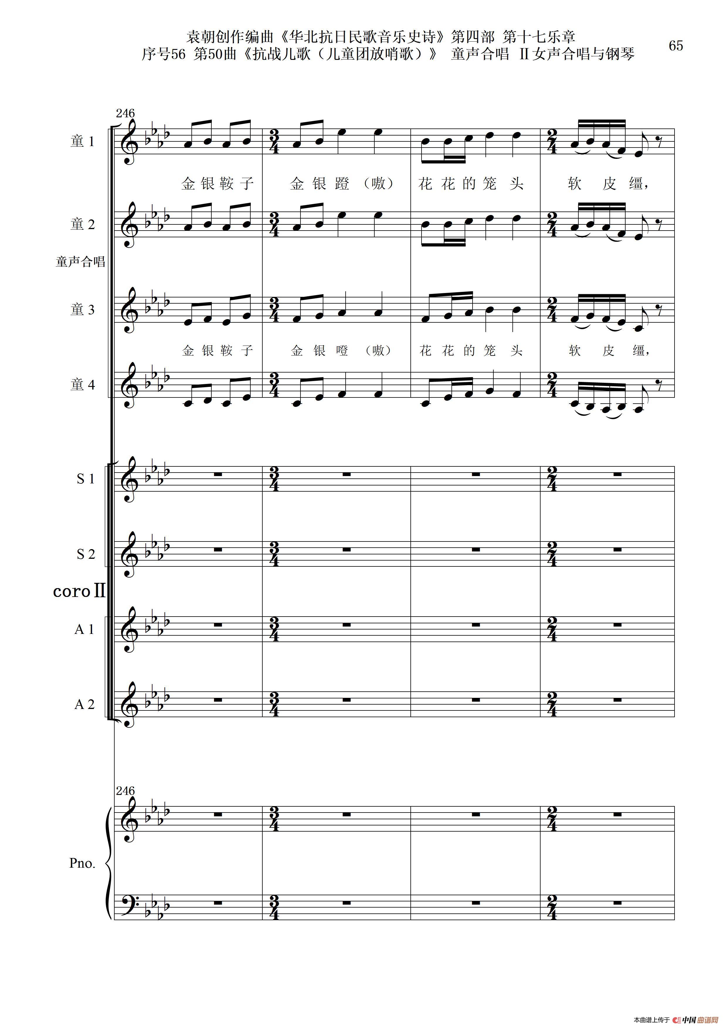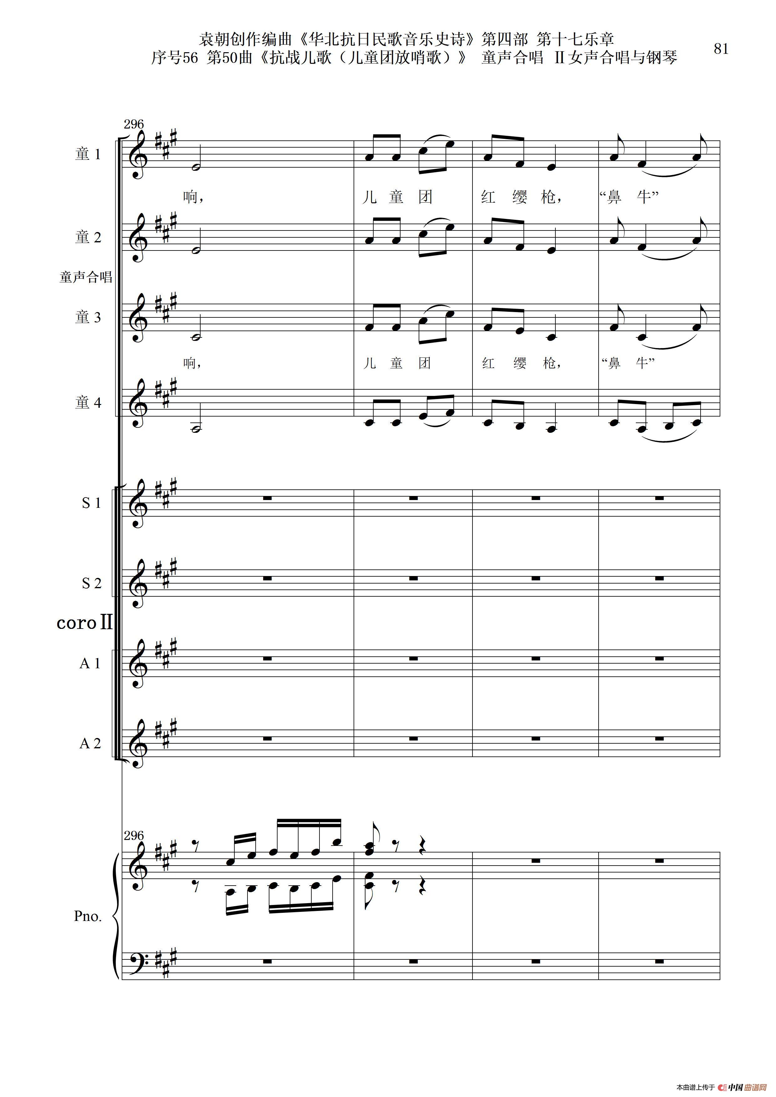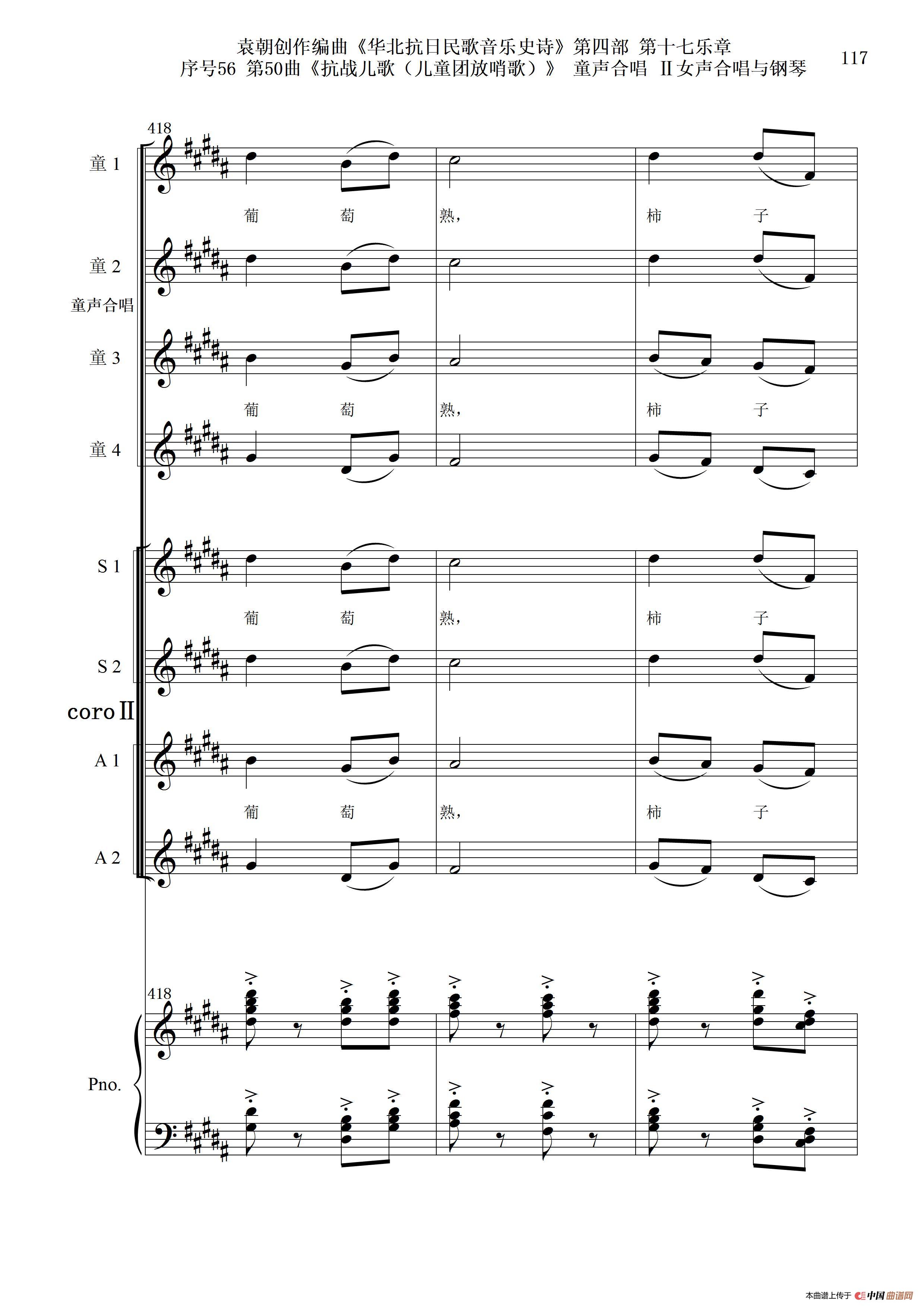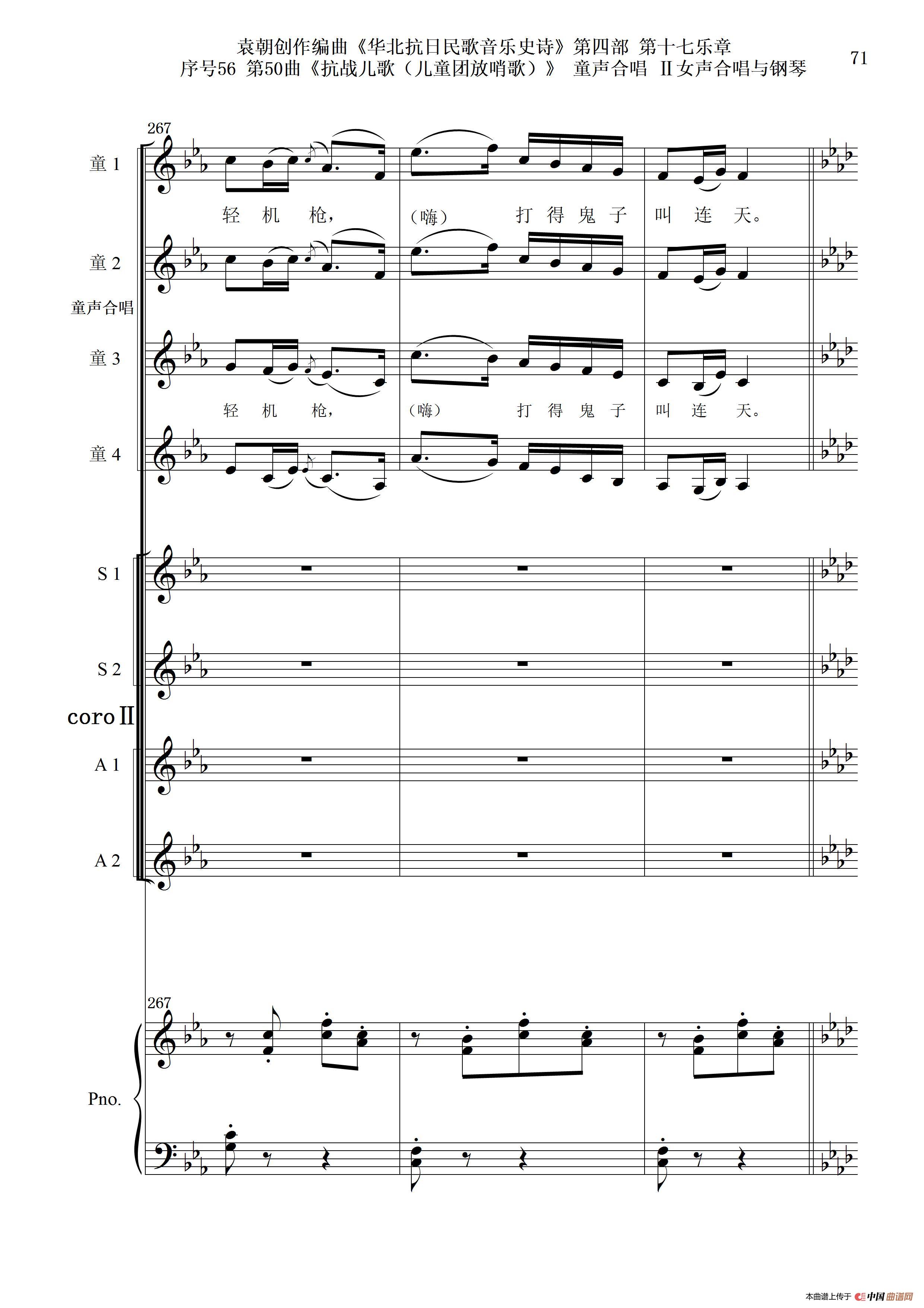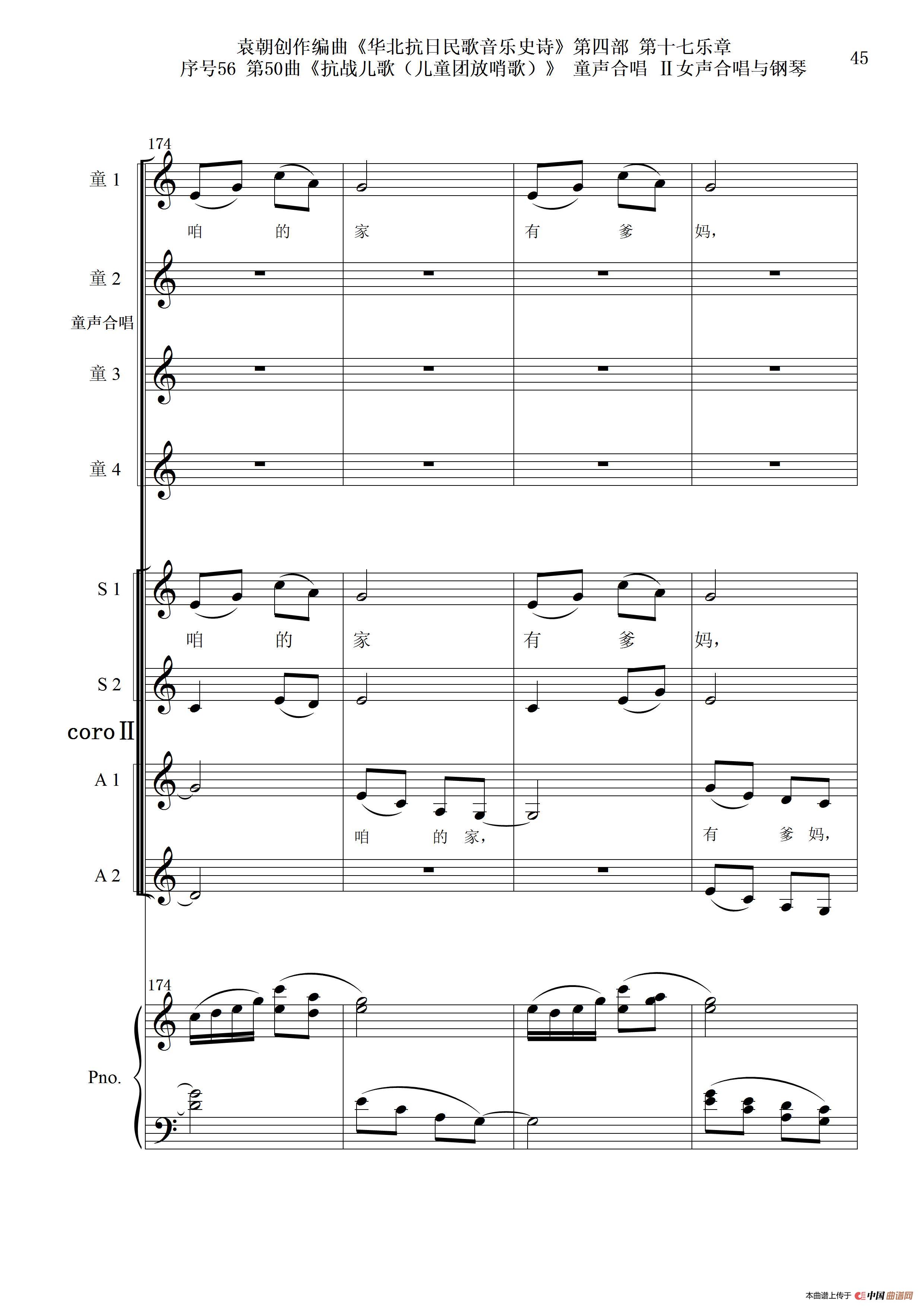 序号56第50曲《抗日儿歌(儿童团放哨歌)》童声合唱(或Ⅰ女声合唱代替)Ⅱ女声合唱与钢琴