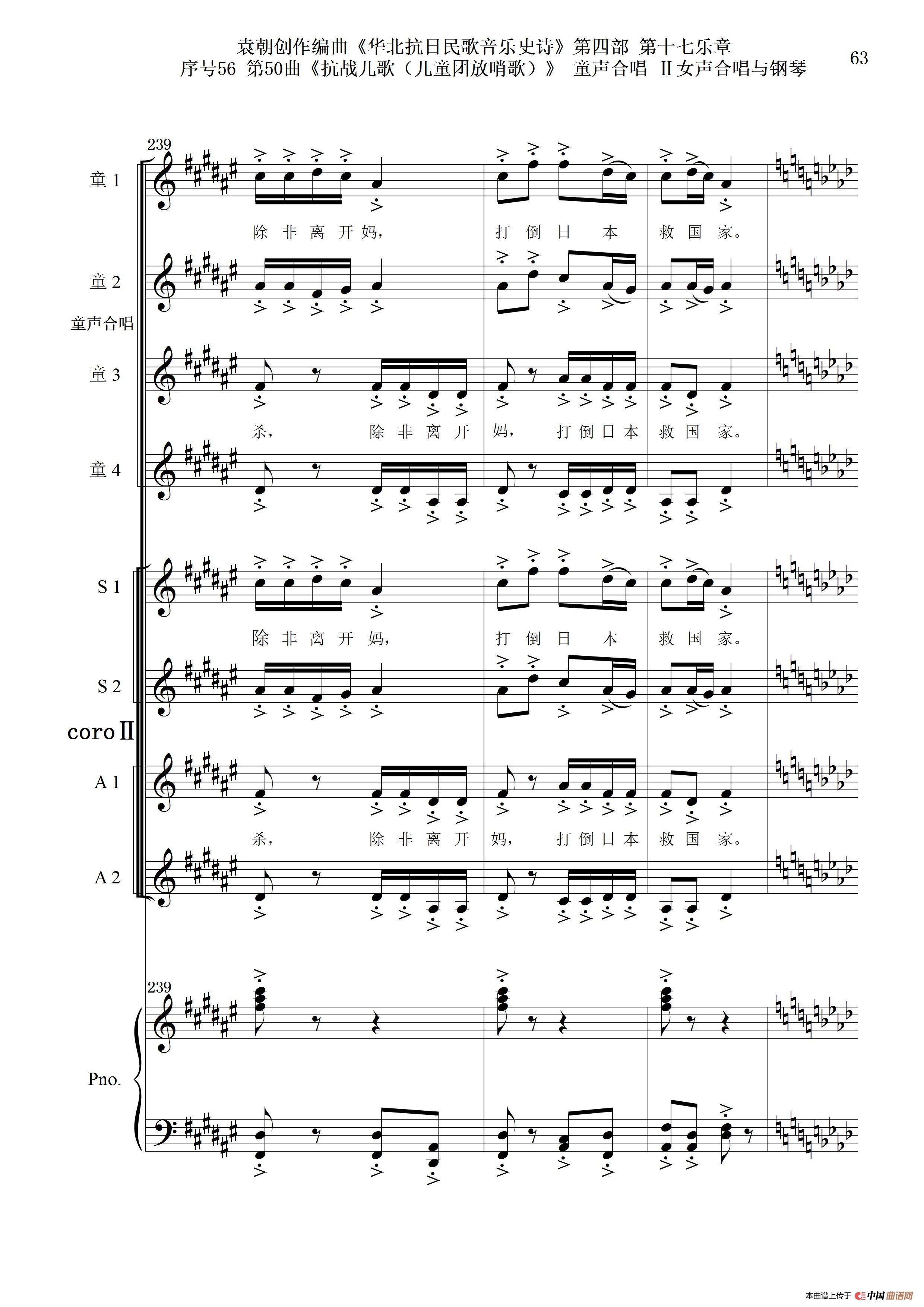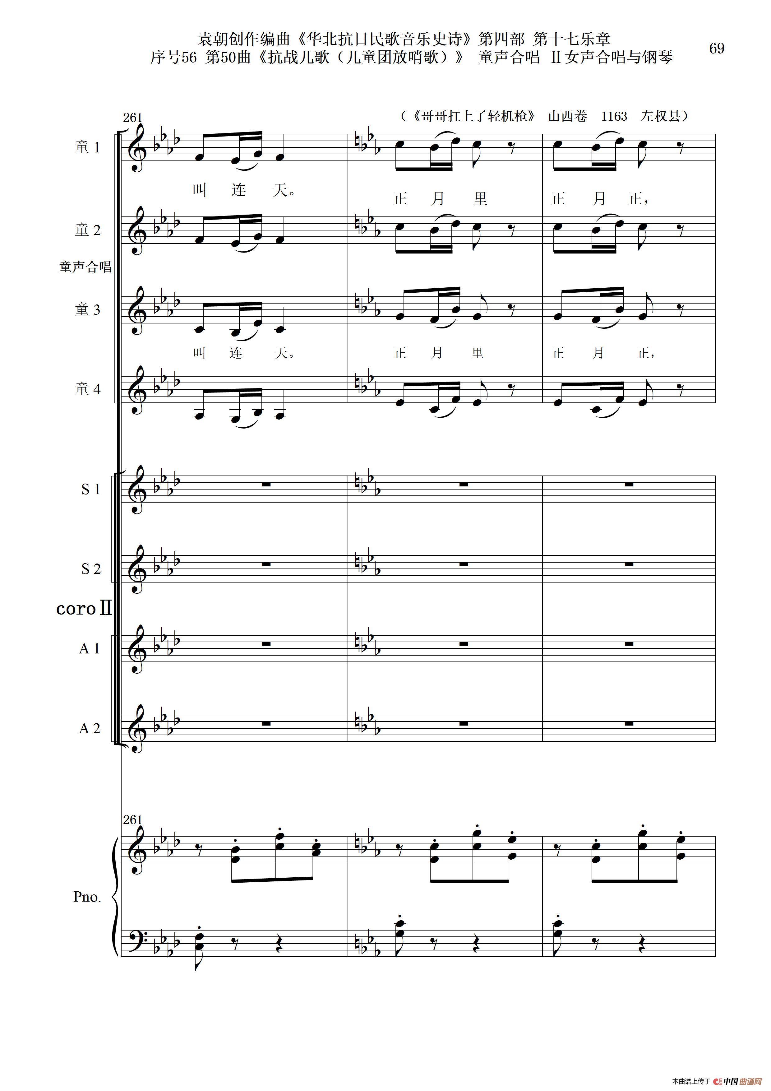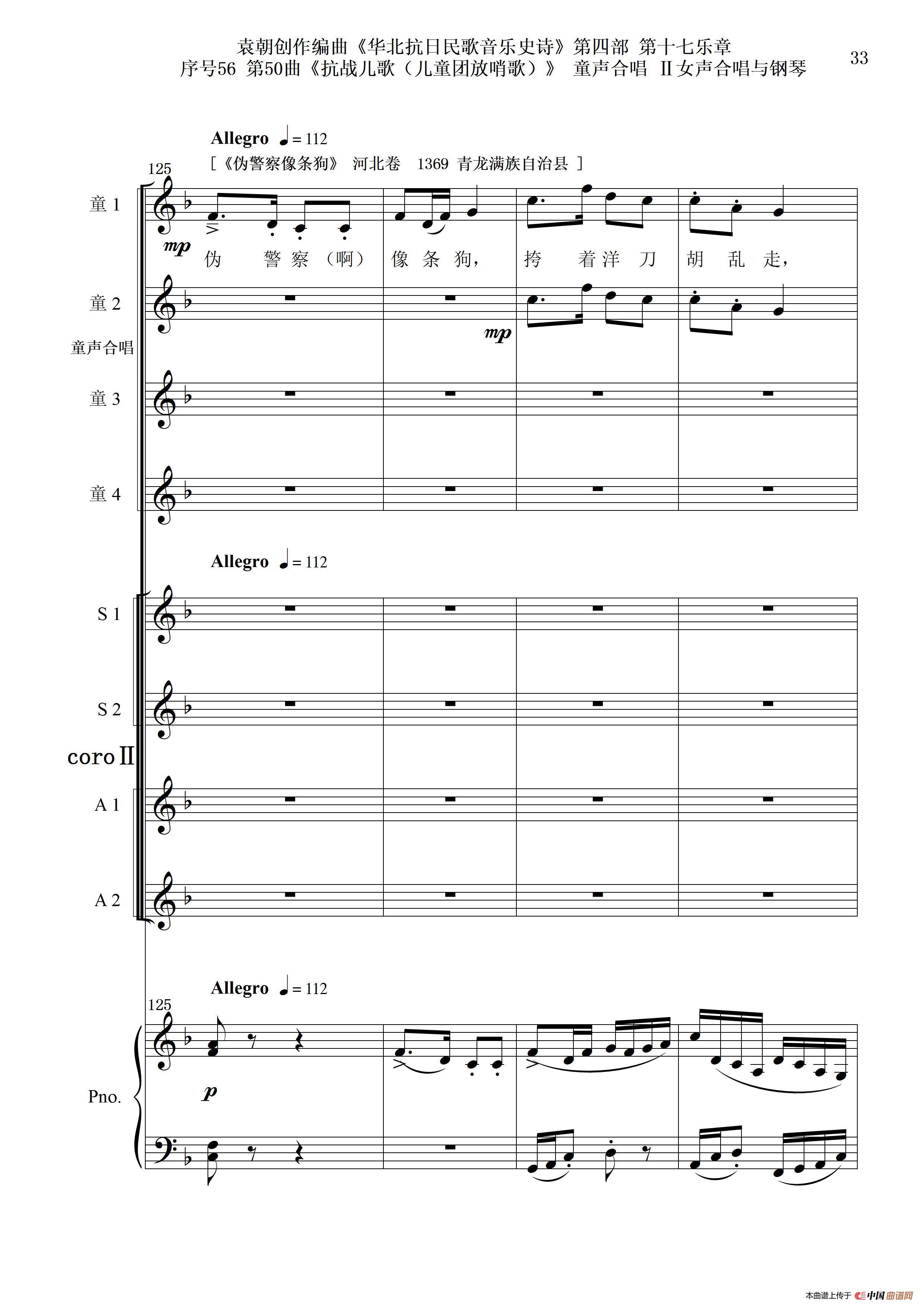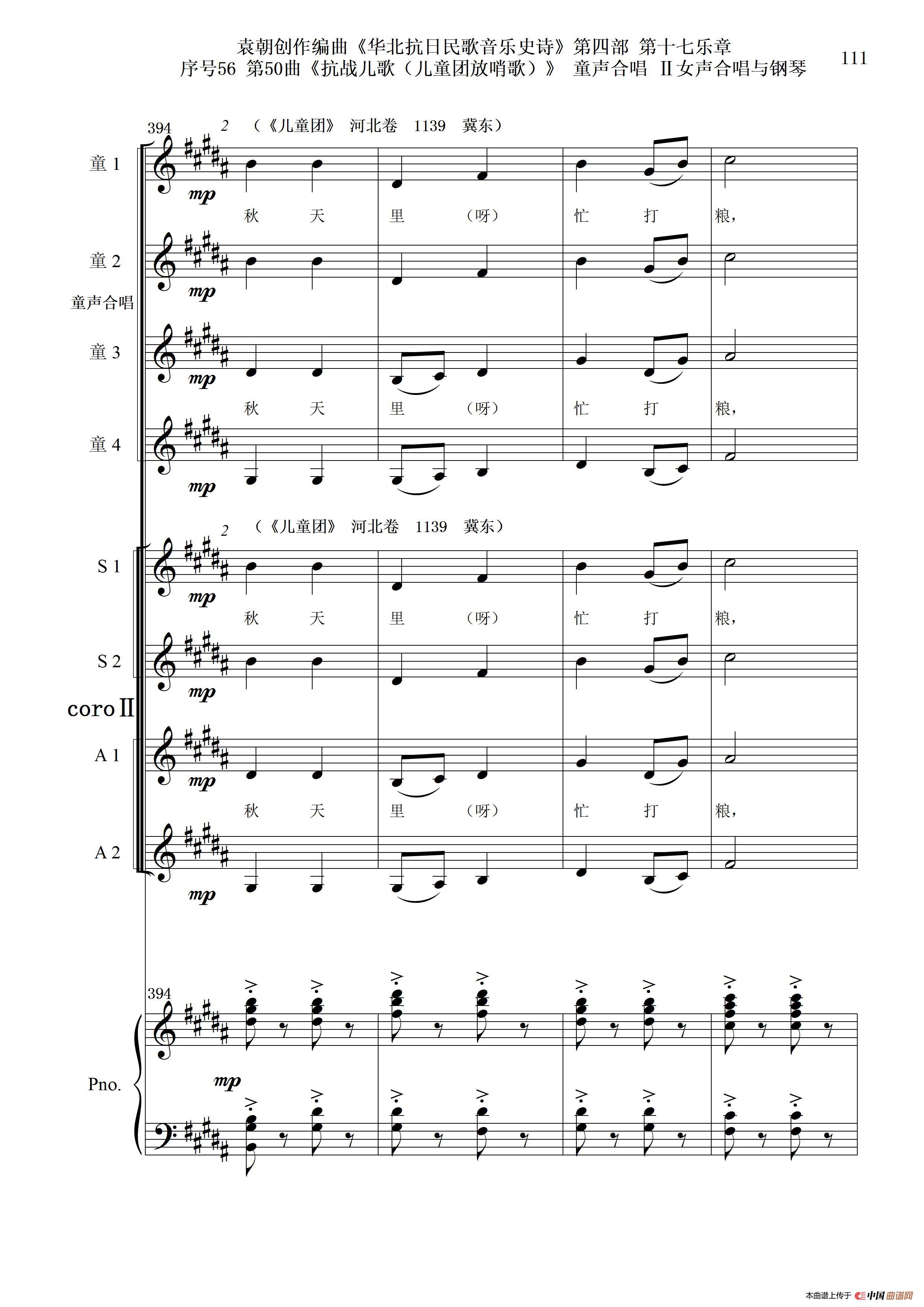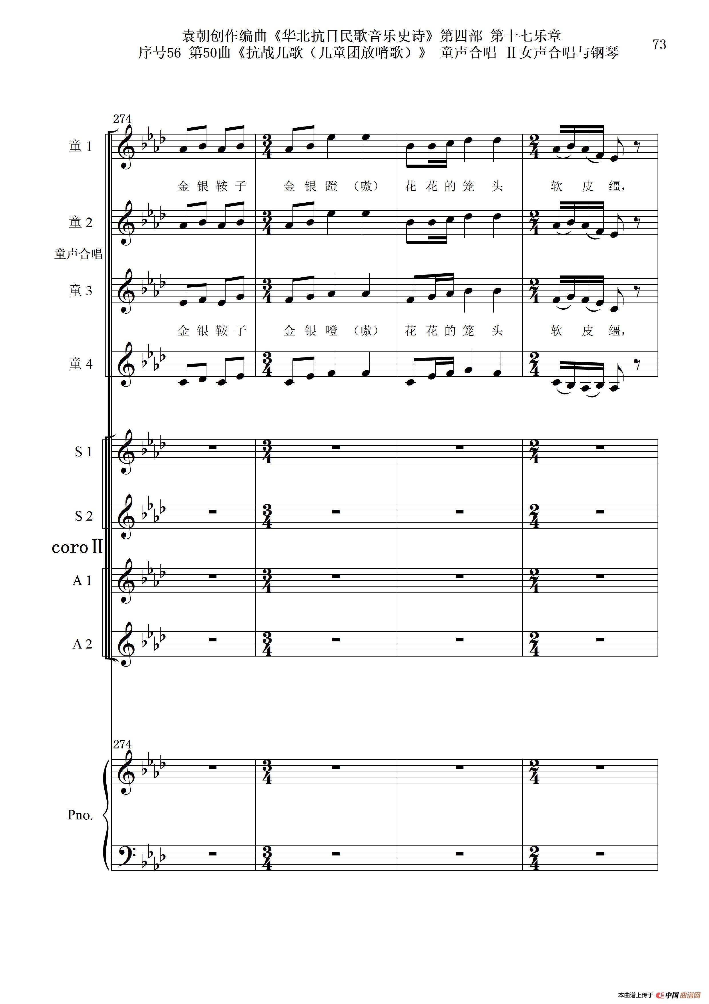 序号56第50曲《抗日儿歌(儿童团放哨歌)》童声合唱(或Ⅰ女声合唱代替)Ⅱ女声合唱与钢琴