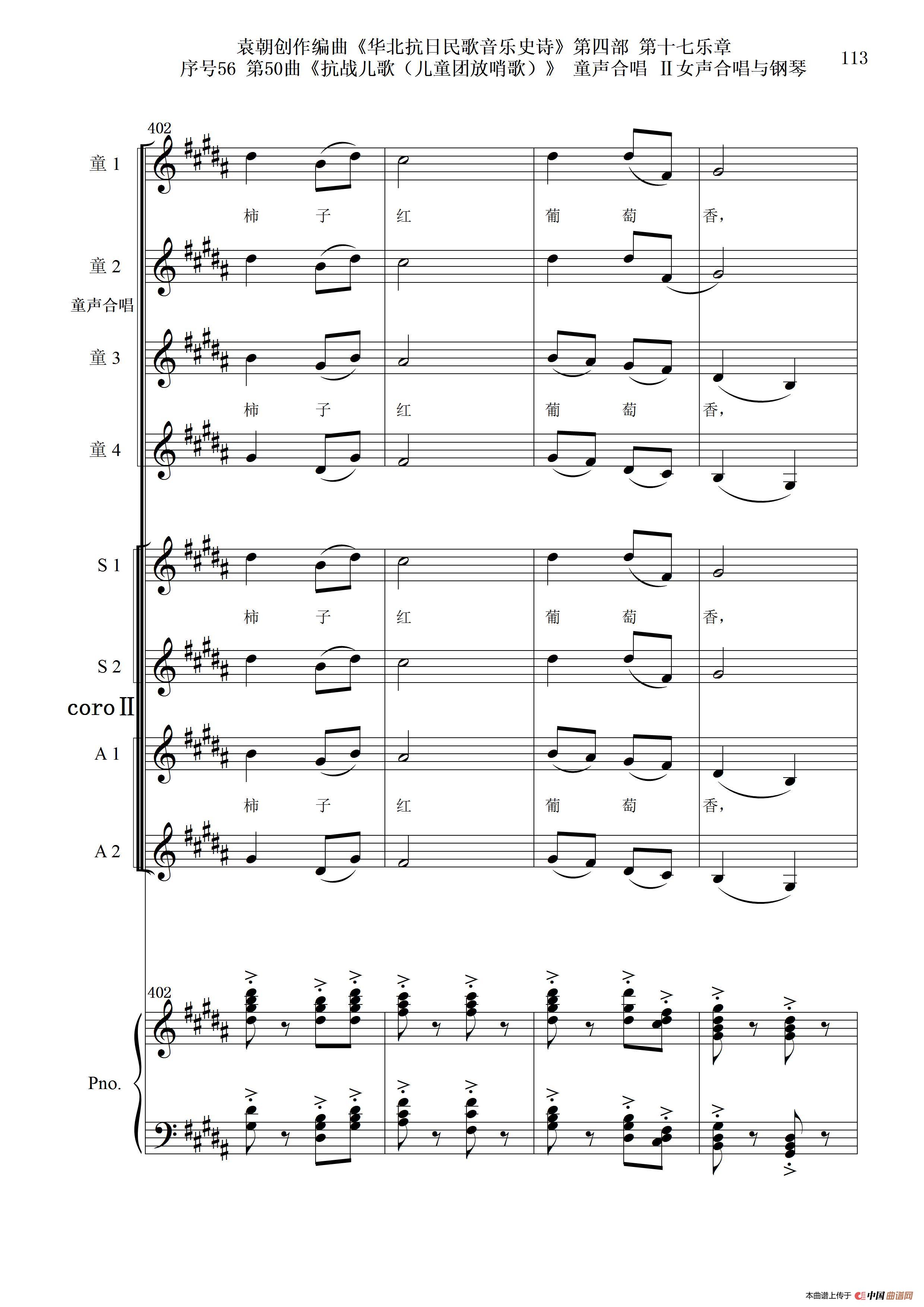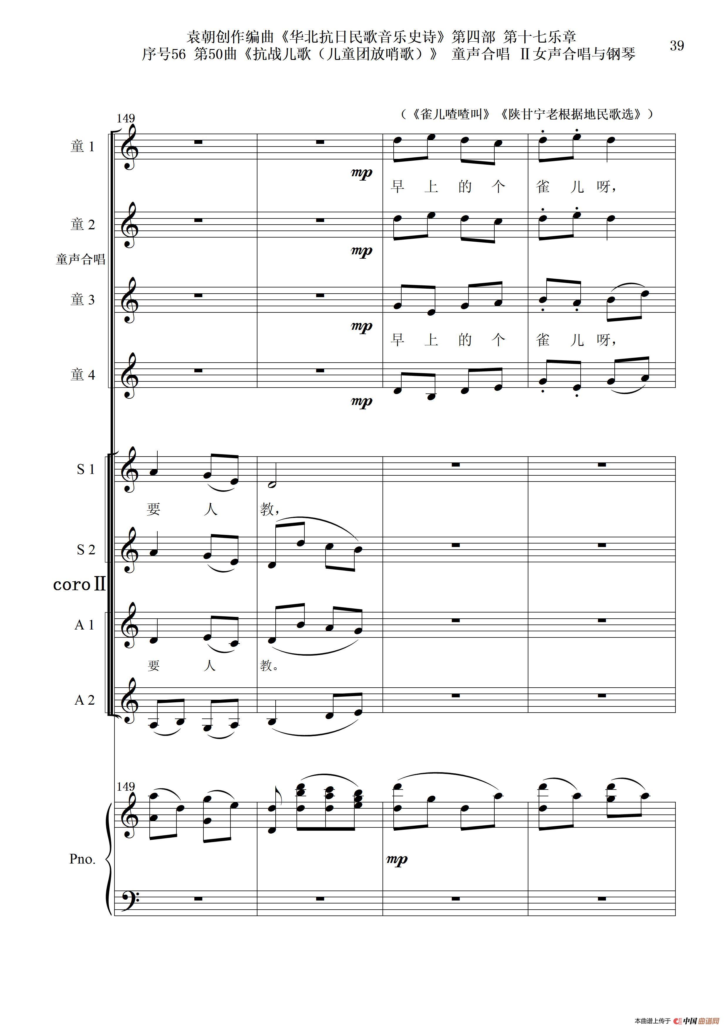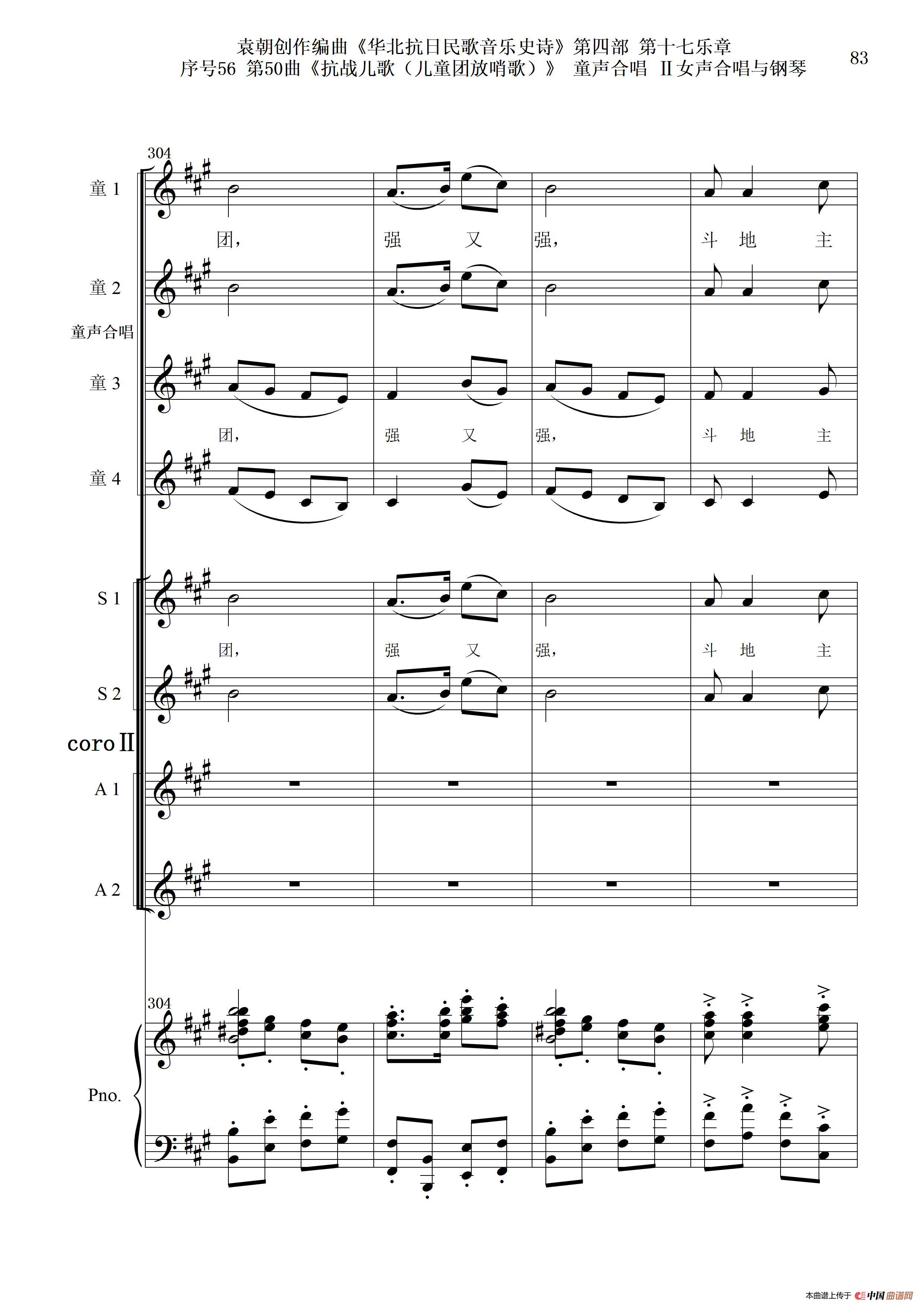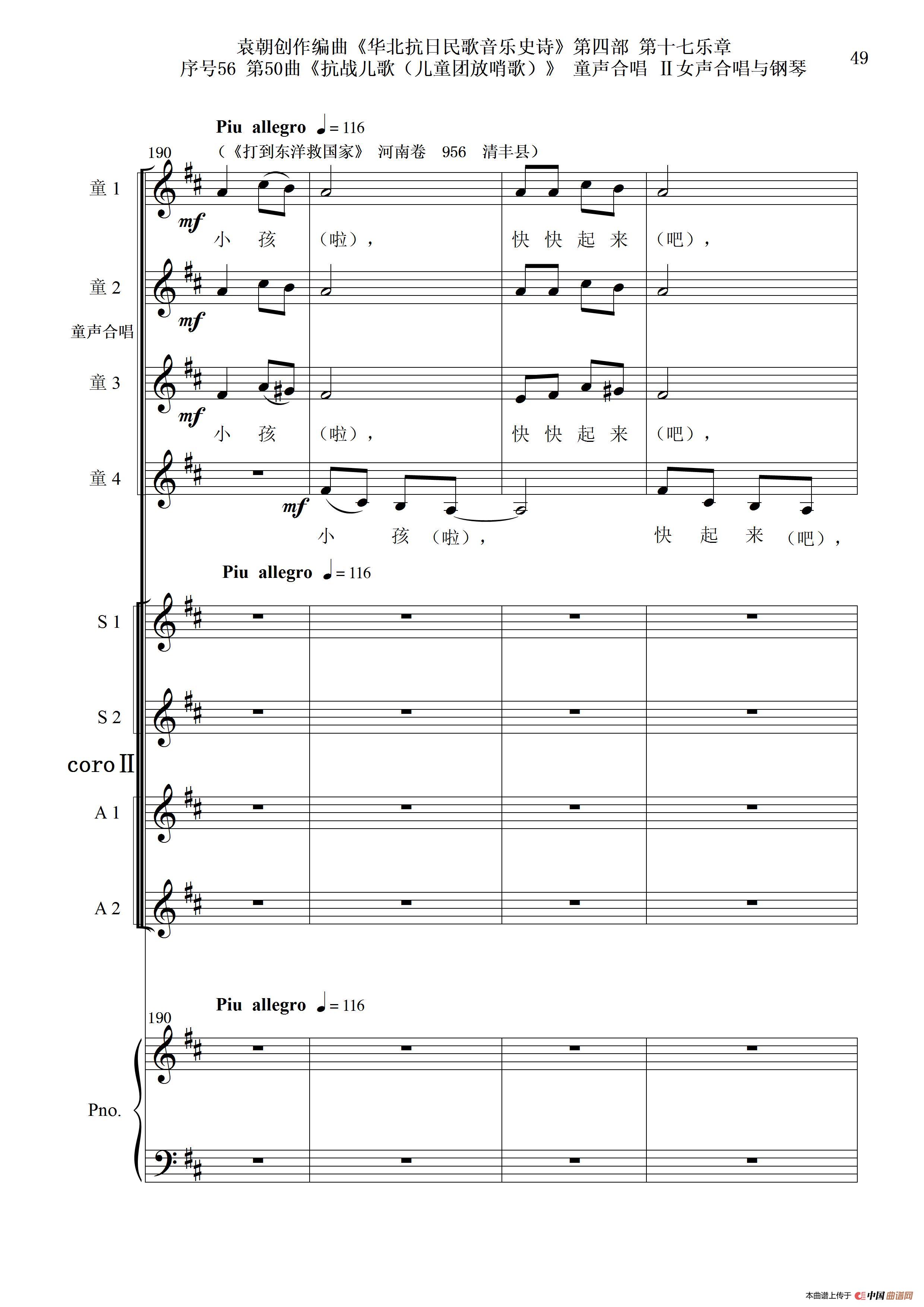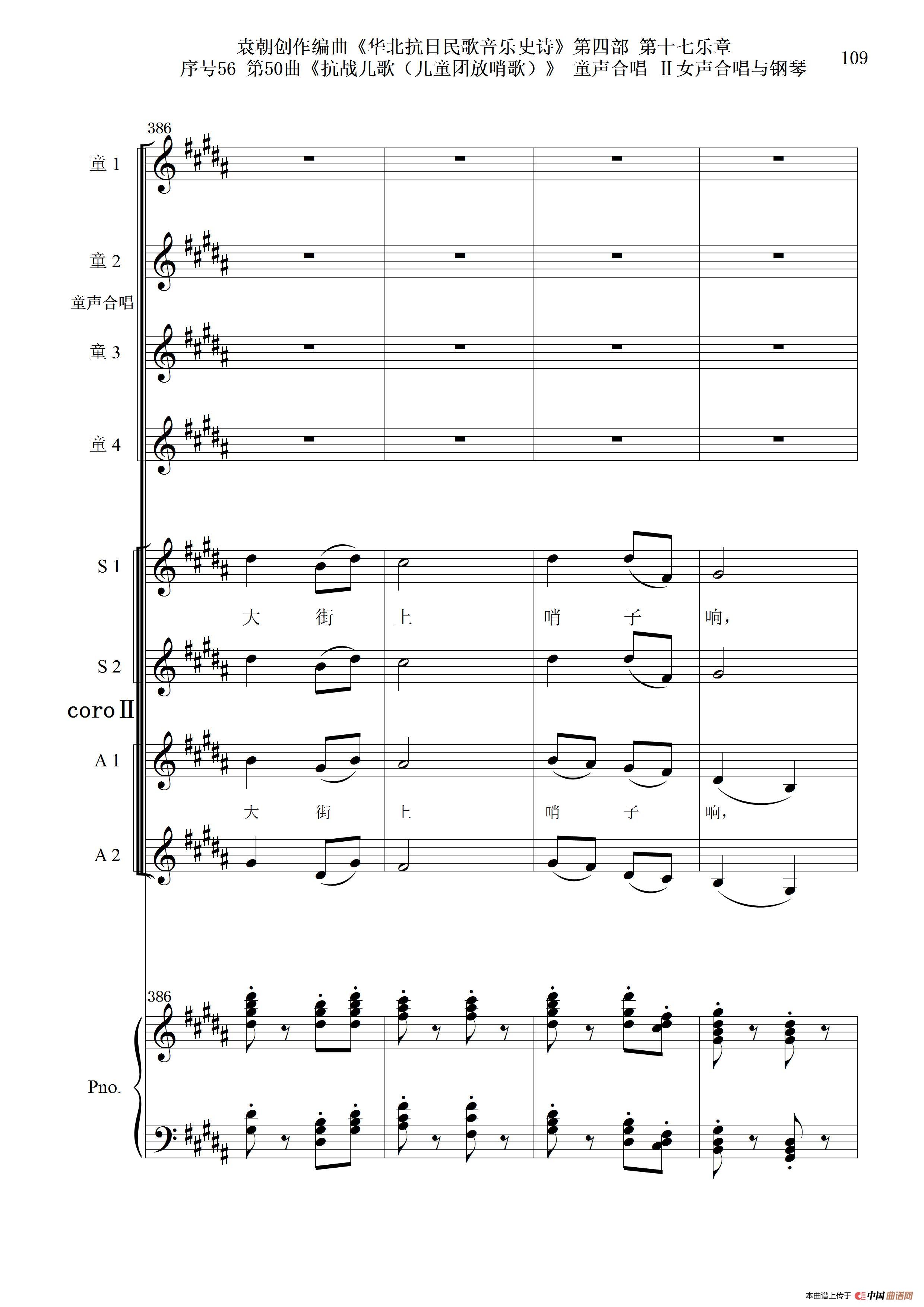 序号56第50曲《抗日儿歌(儿童团放哨歌)》童声合唱(或Ⅰ女声合唱代替)Ⅱ女声合唱与钢琴