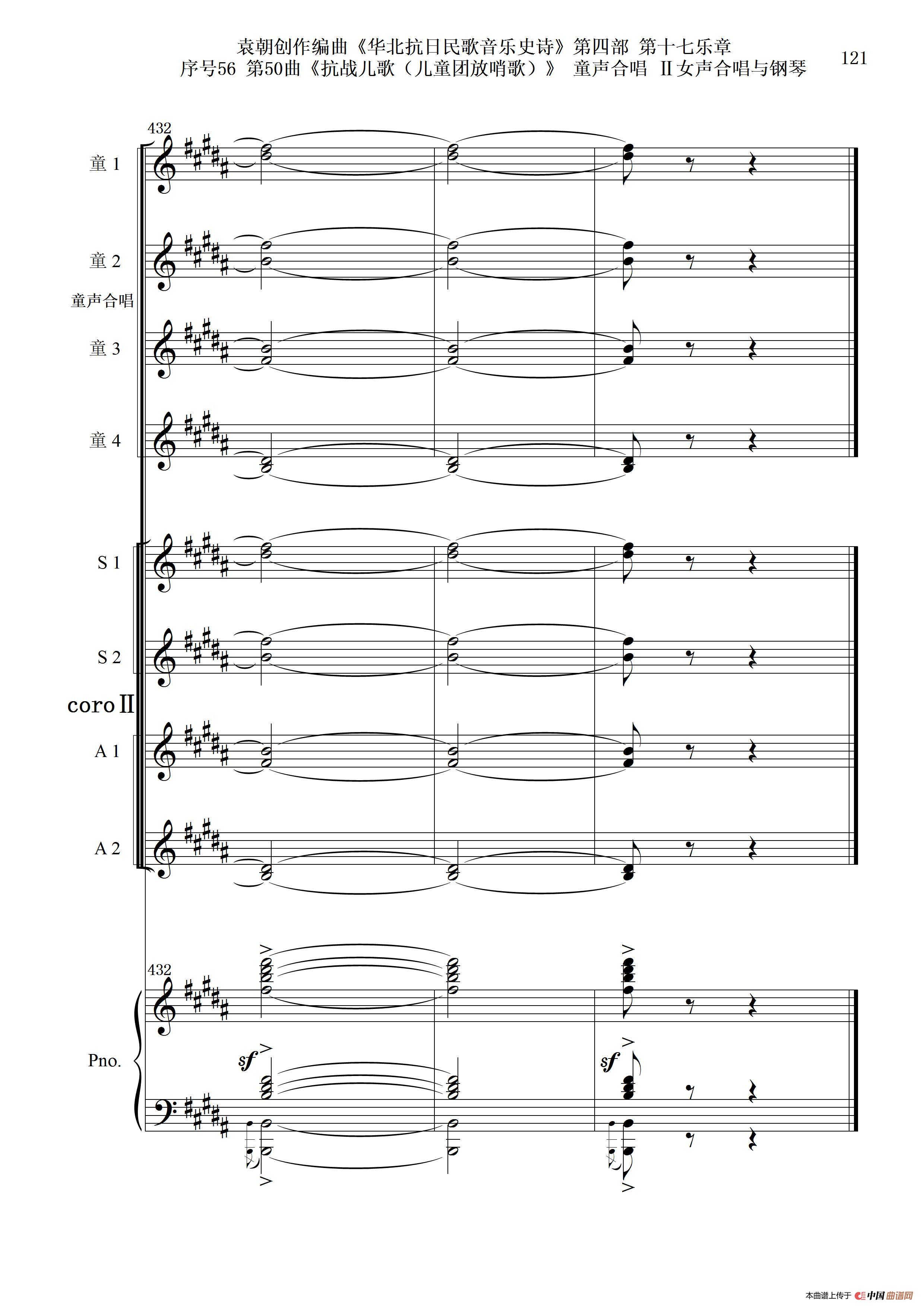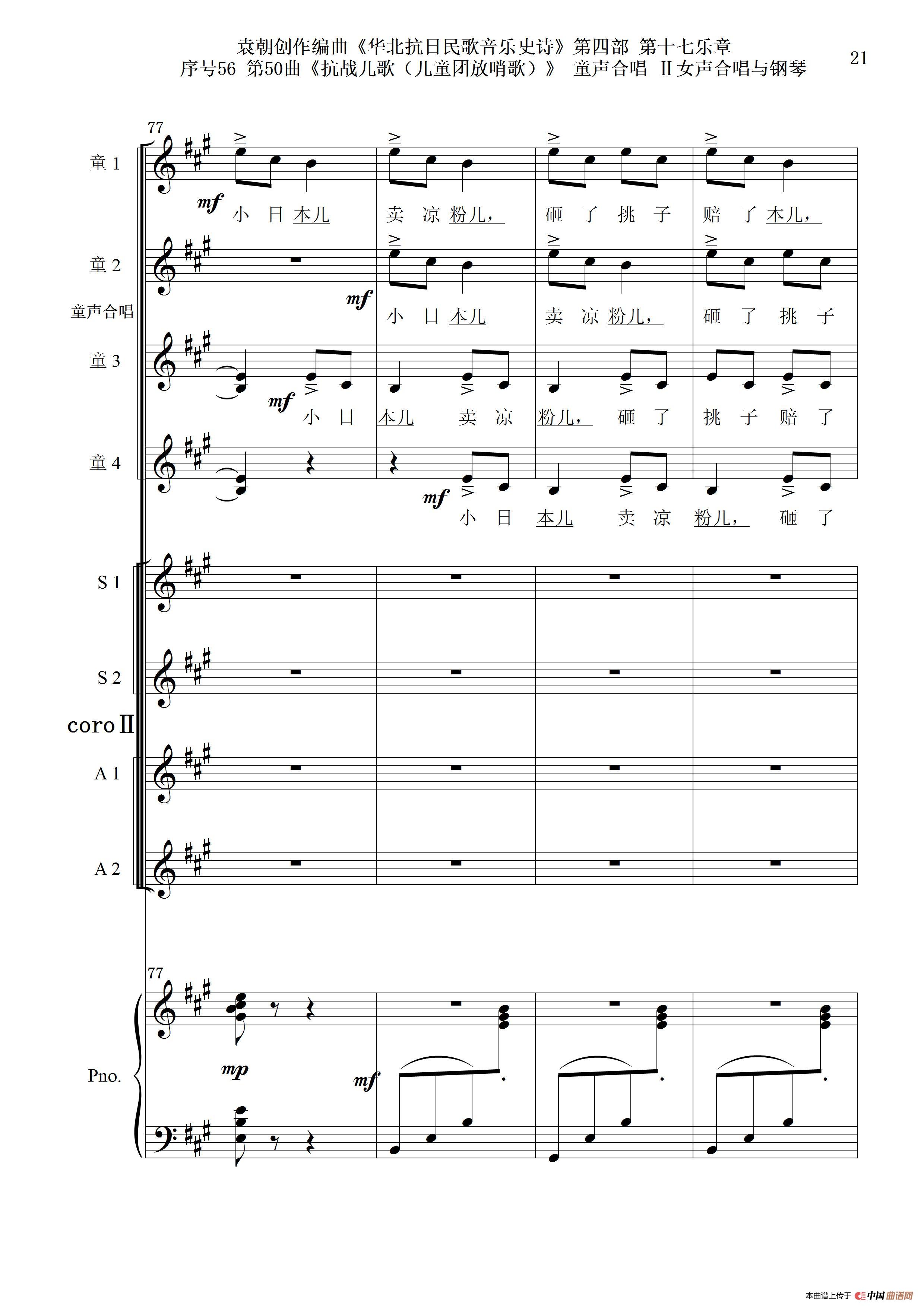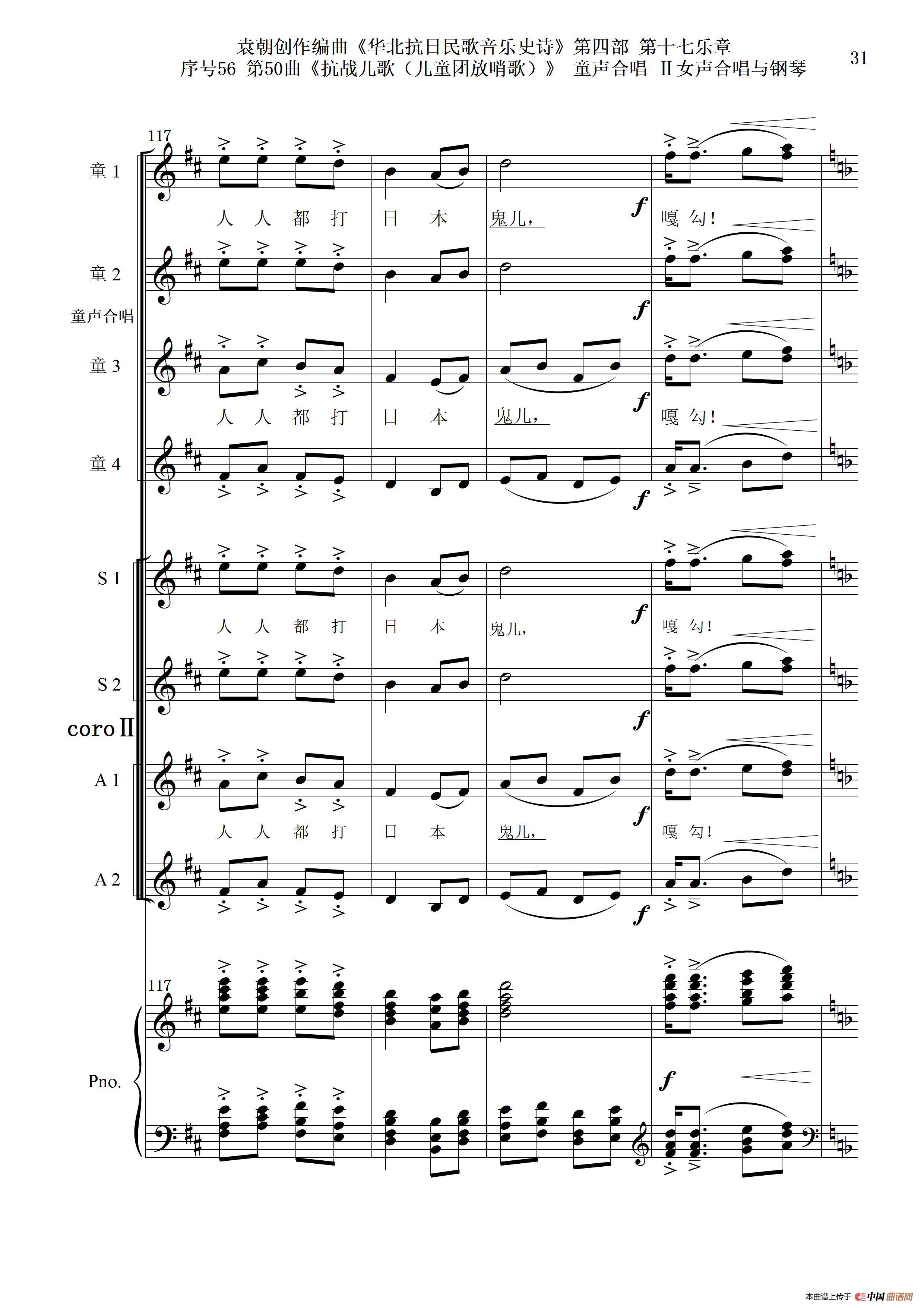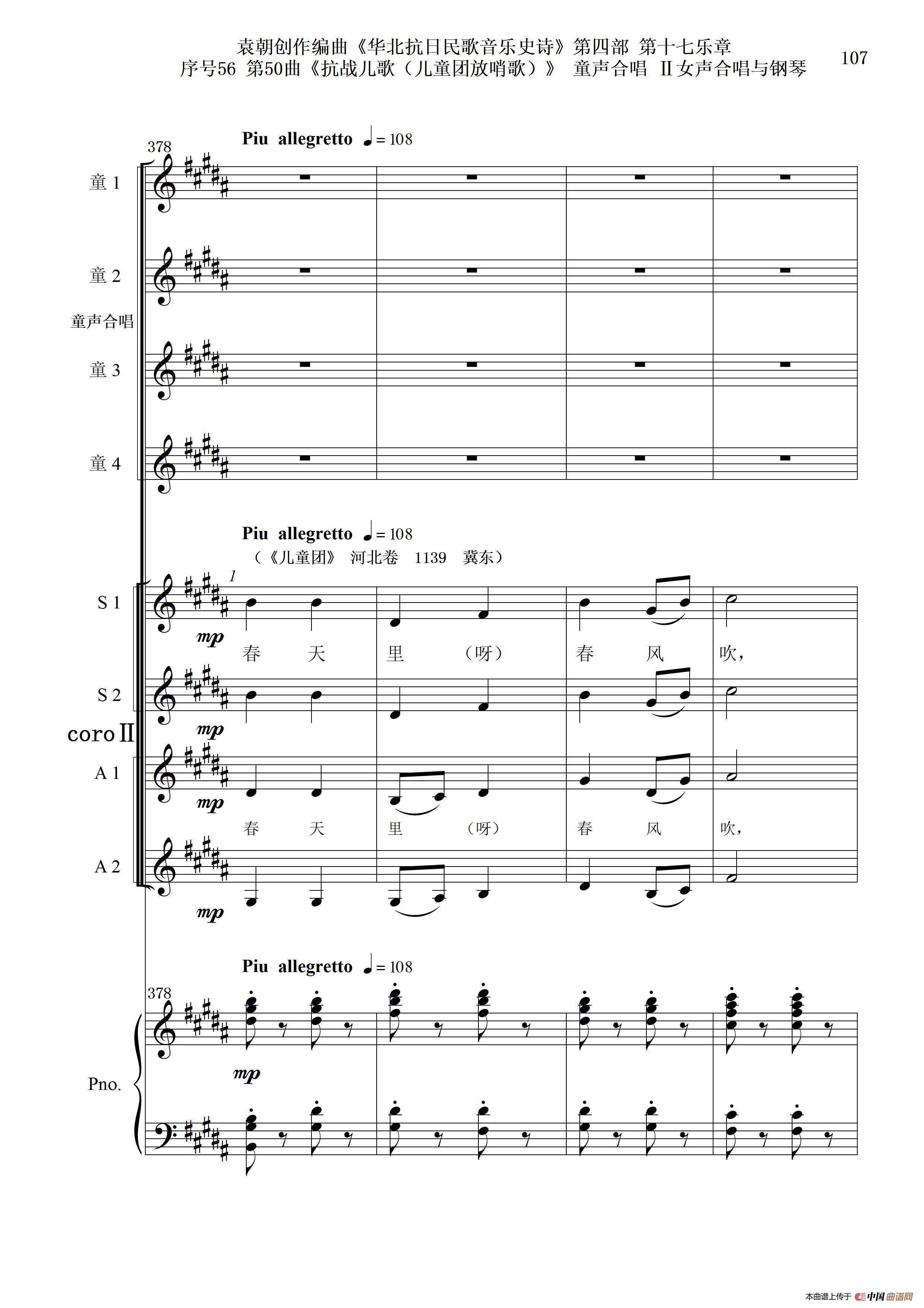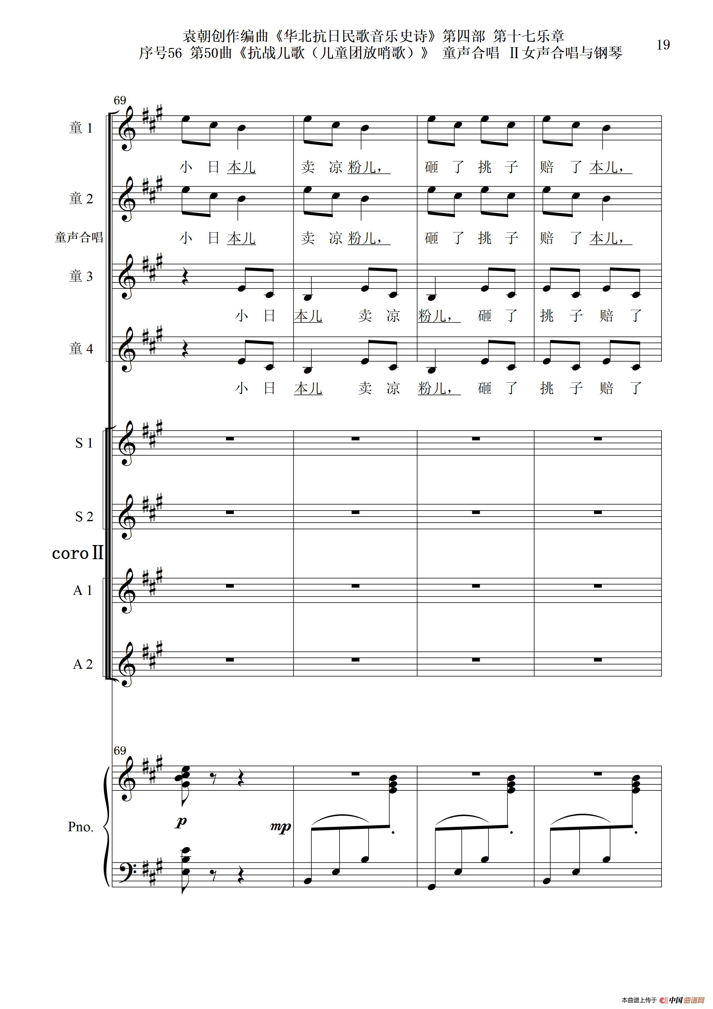 序号56第50曲《抗日儿歌(儿童团放哨歌)》童声合唱(或Ⅰ女声合唱代替)Ⅱ女声合唱与钢琴