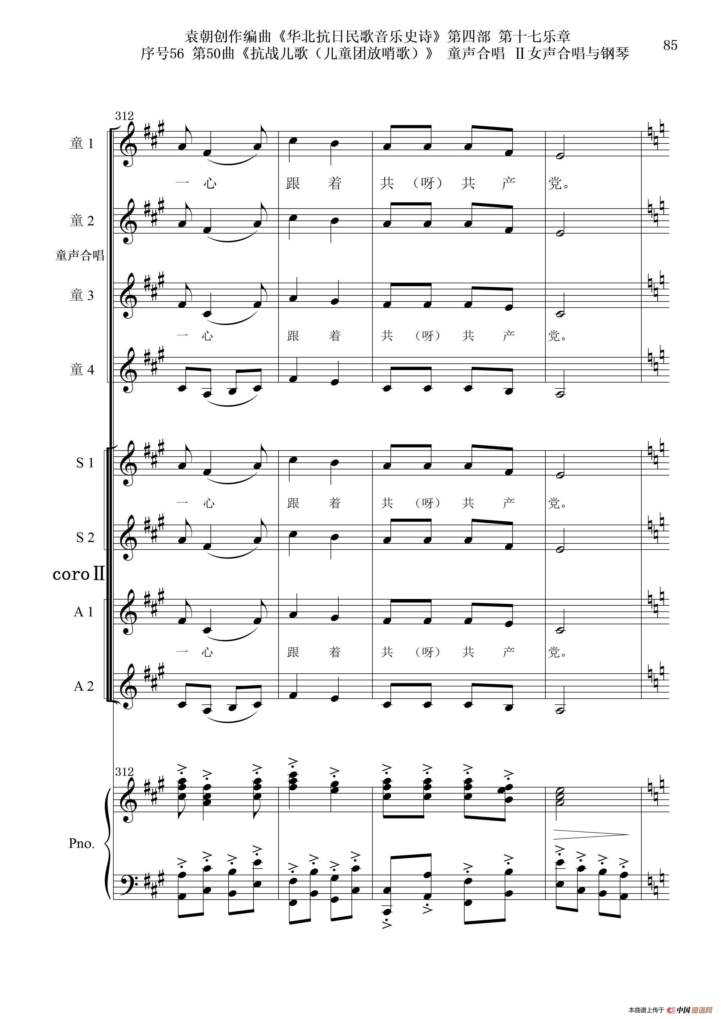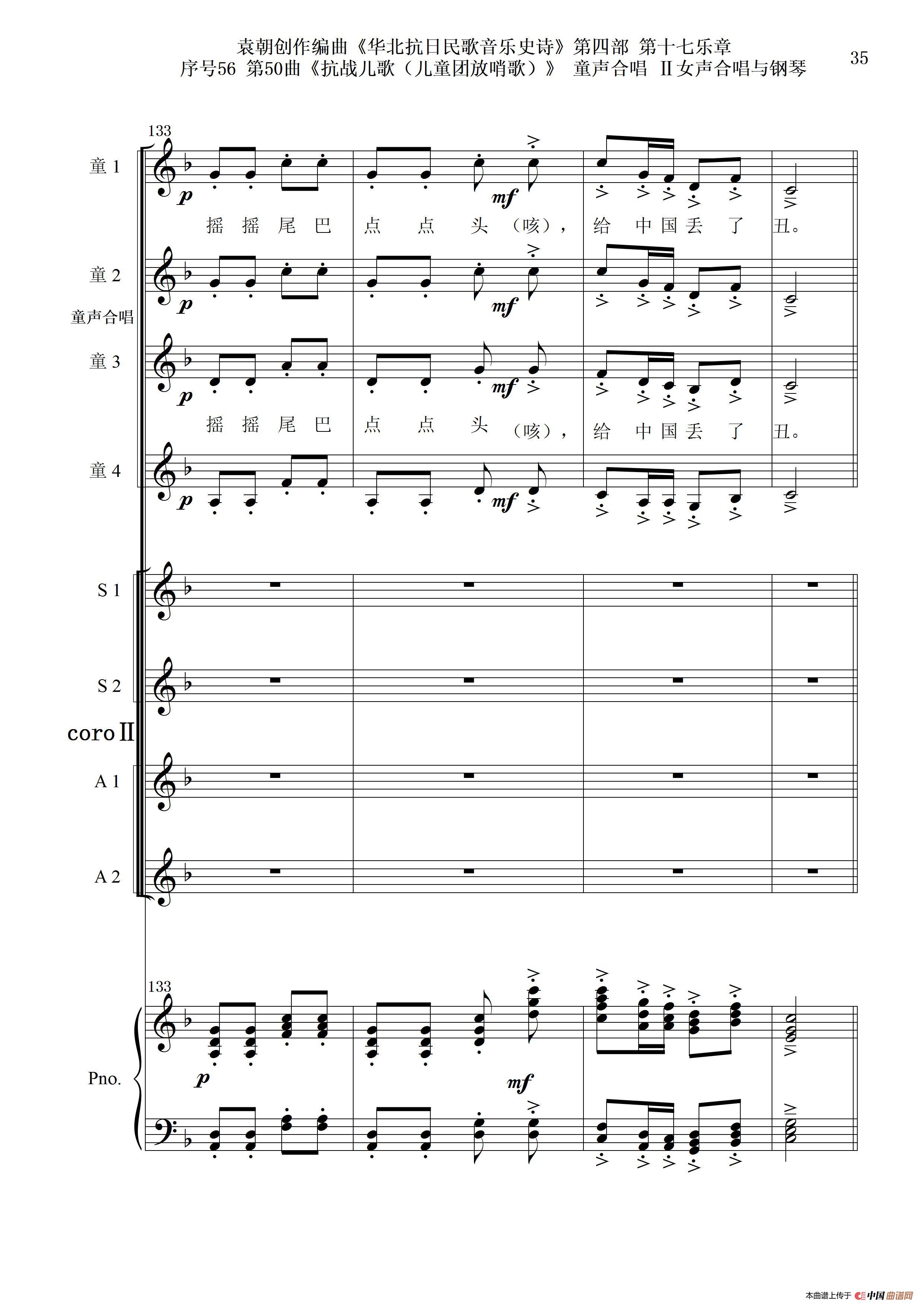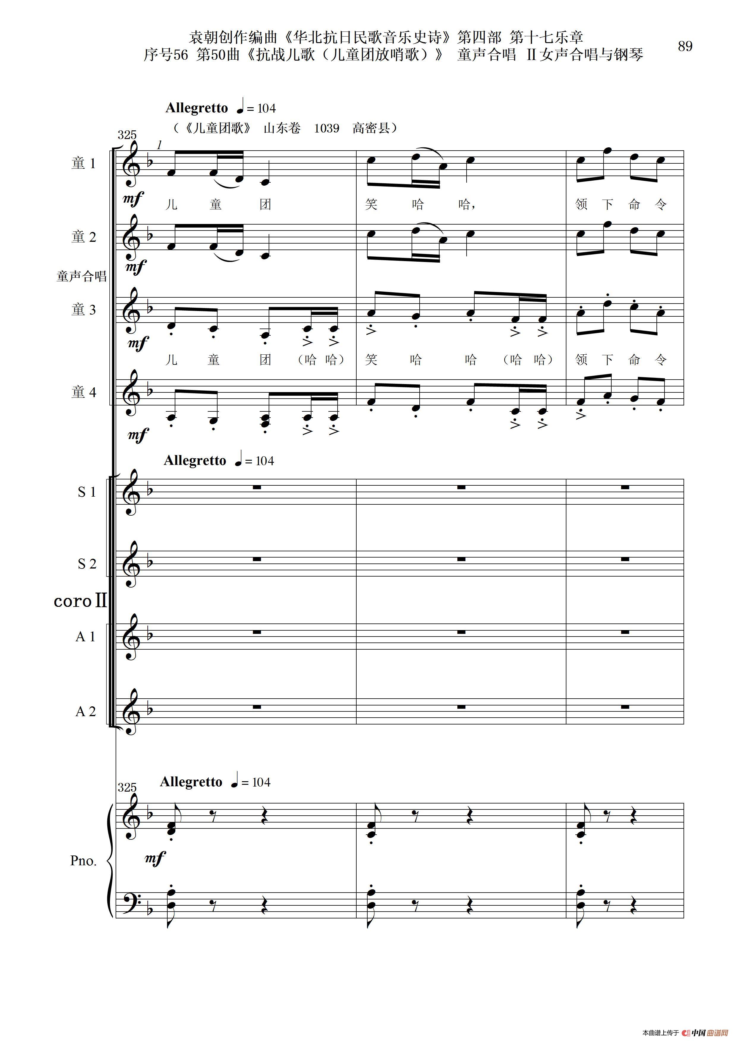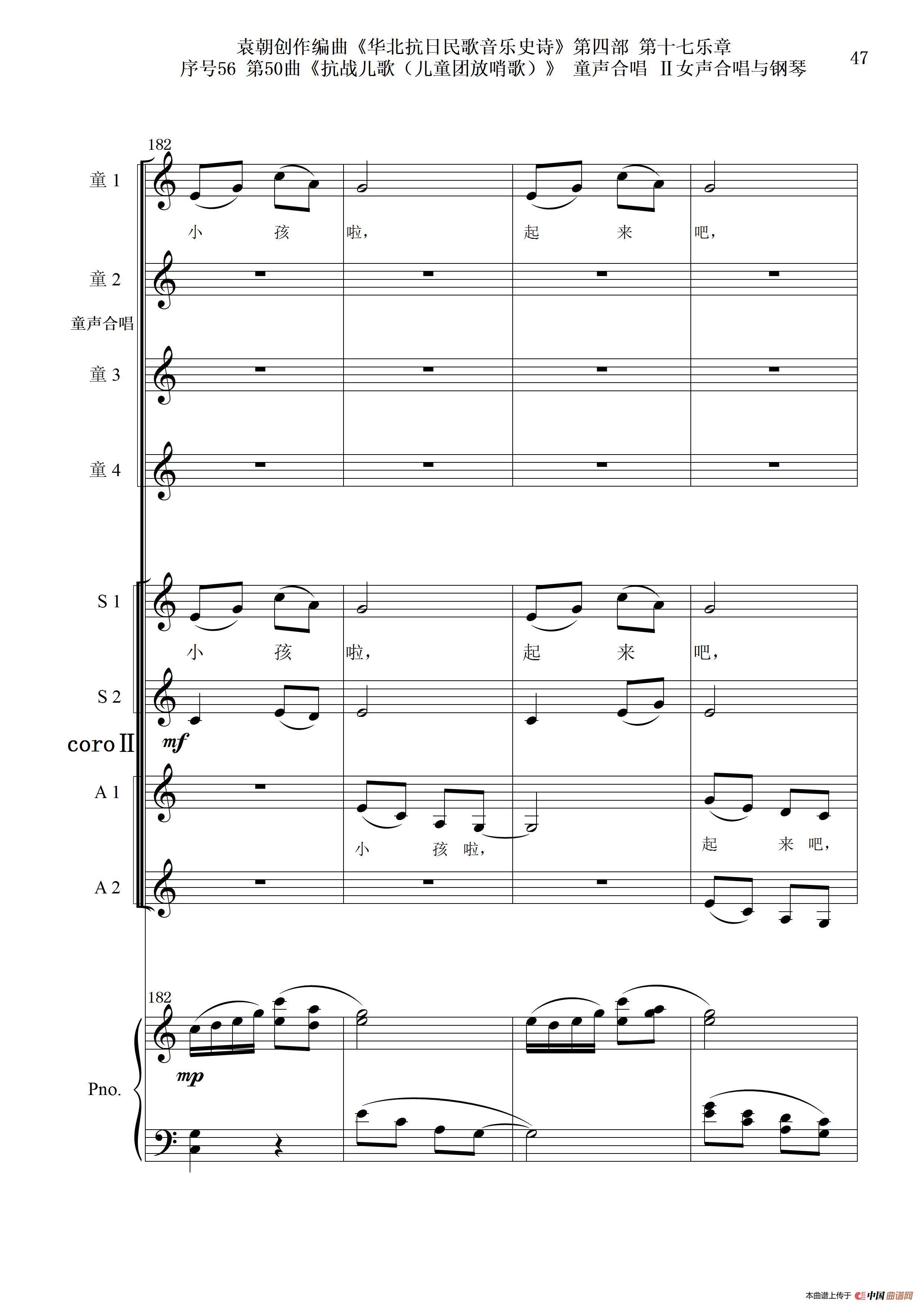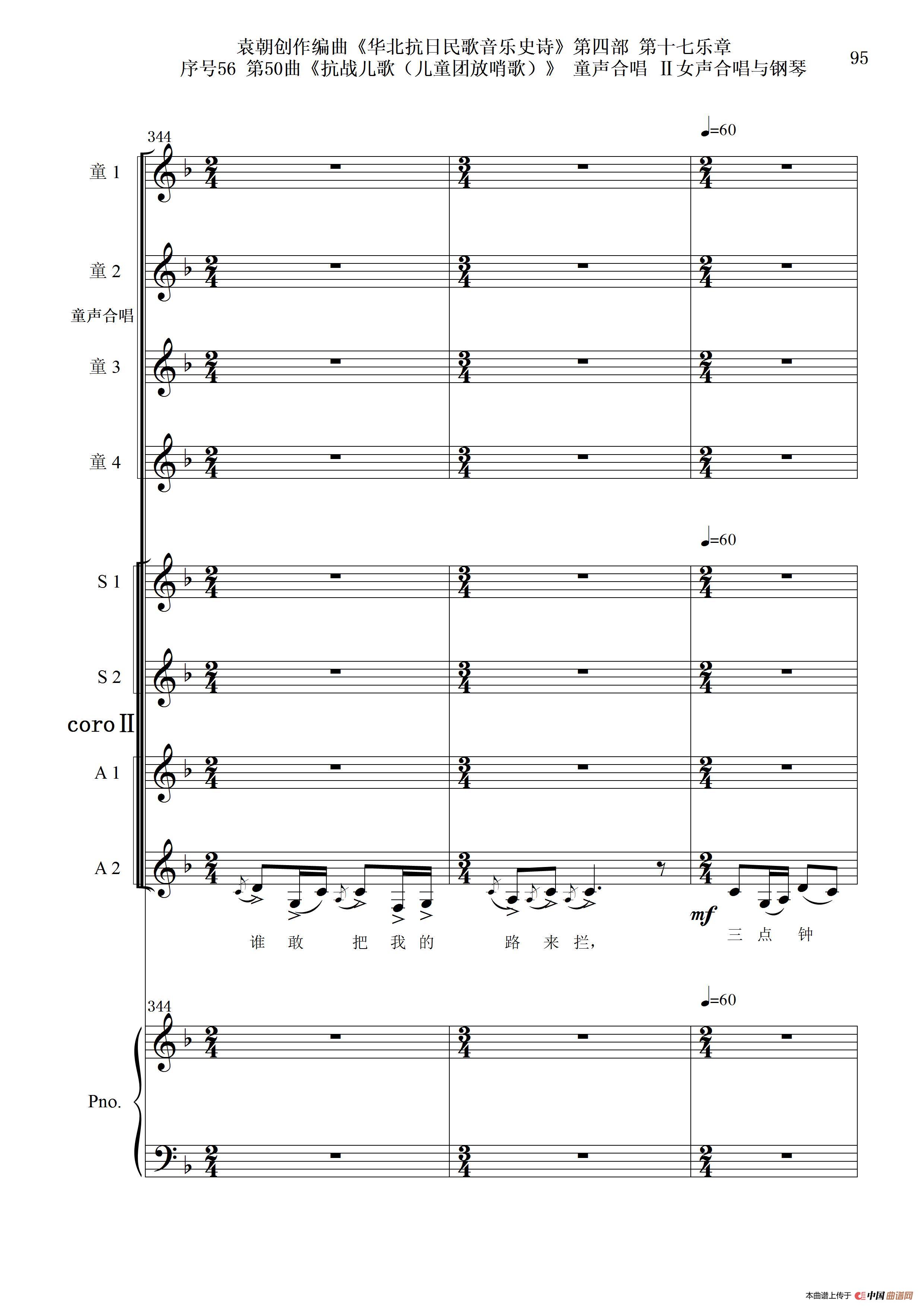 序号56第50曲《抗日儿歌(儿童团放哨歌)》童声合唱(或Ⅰ女声合唱代替)Ⅱ女声合唱与钢琴