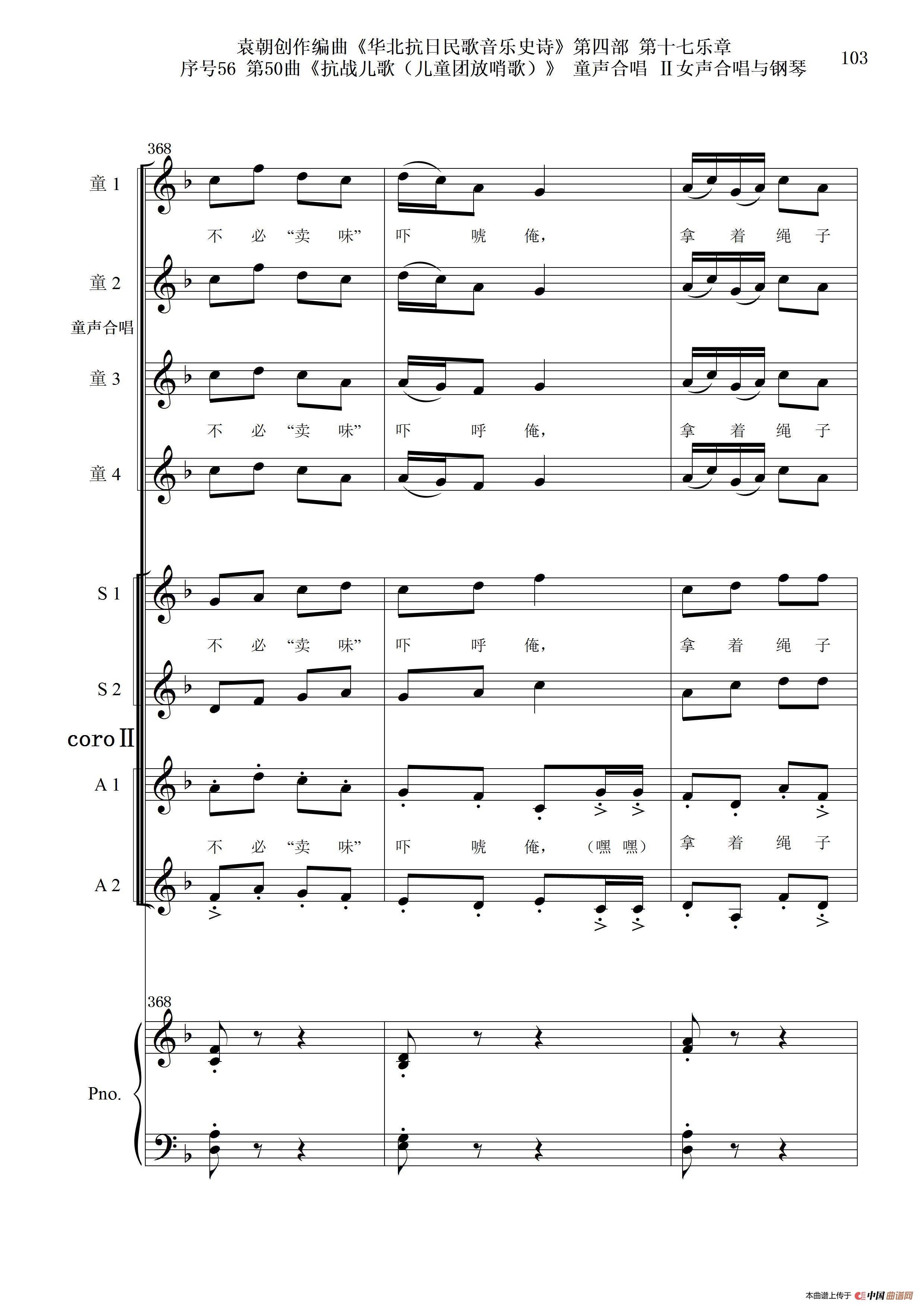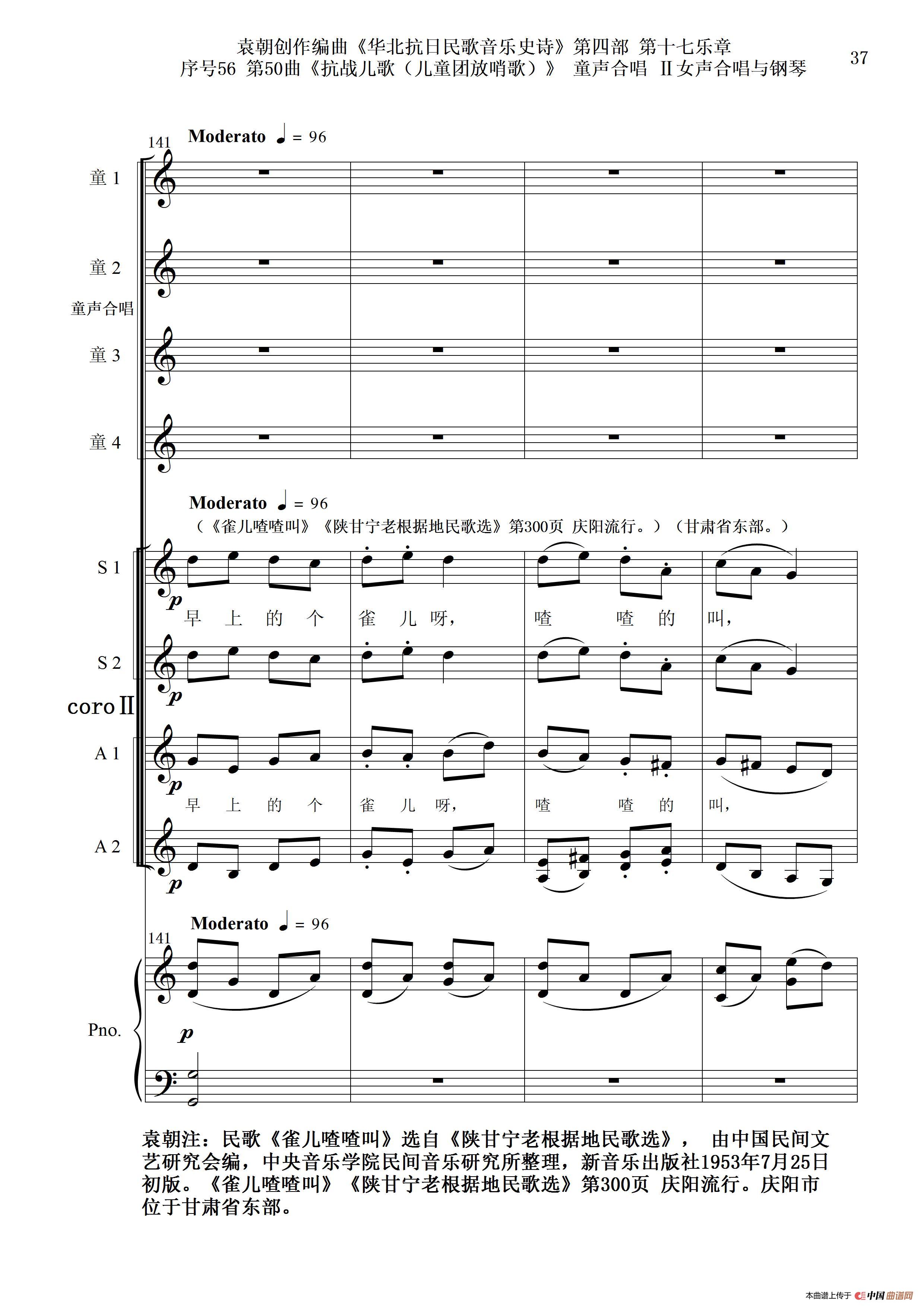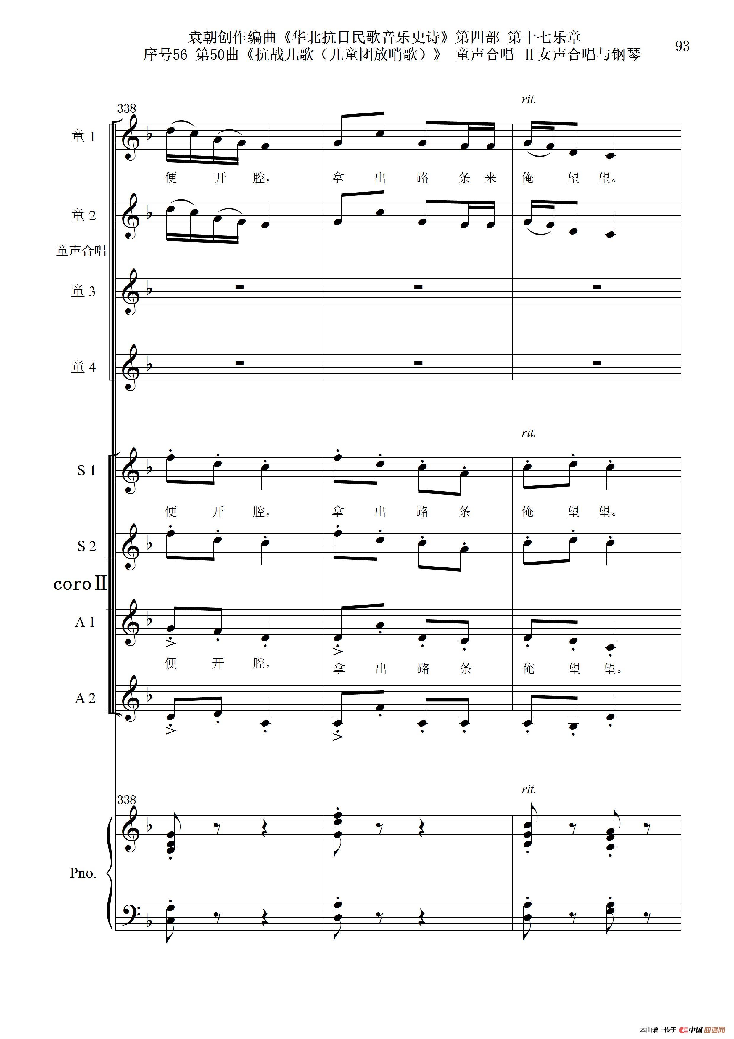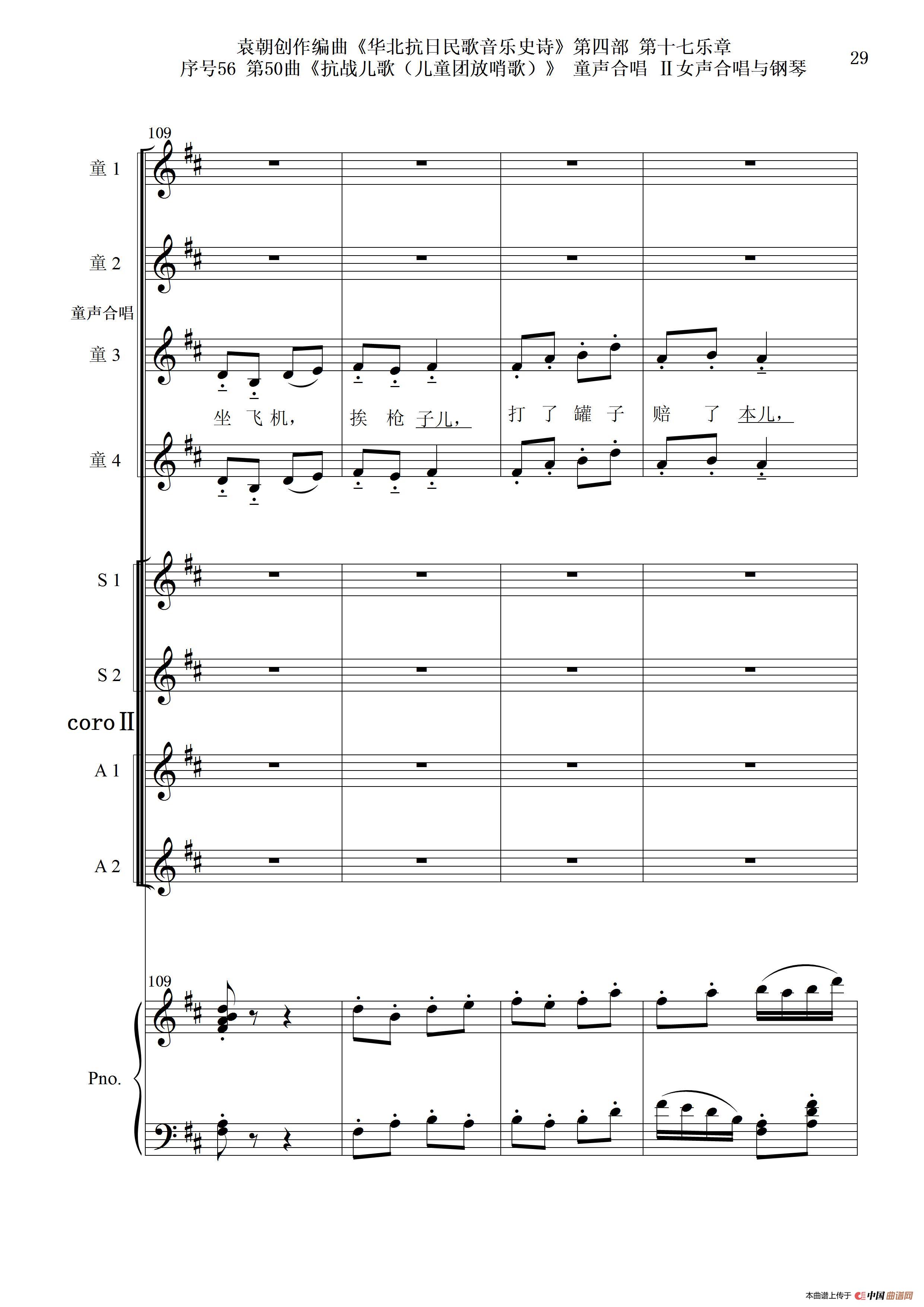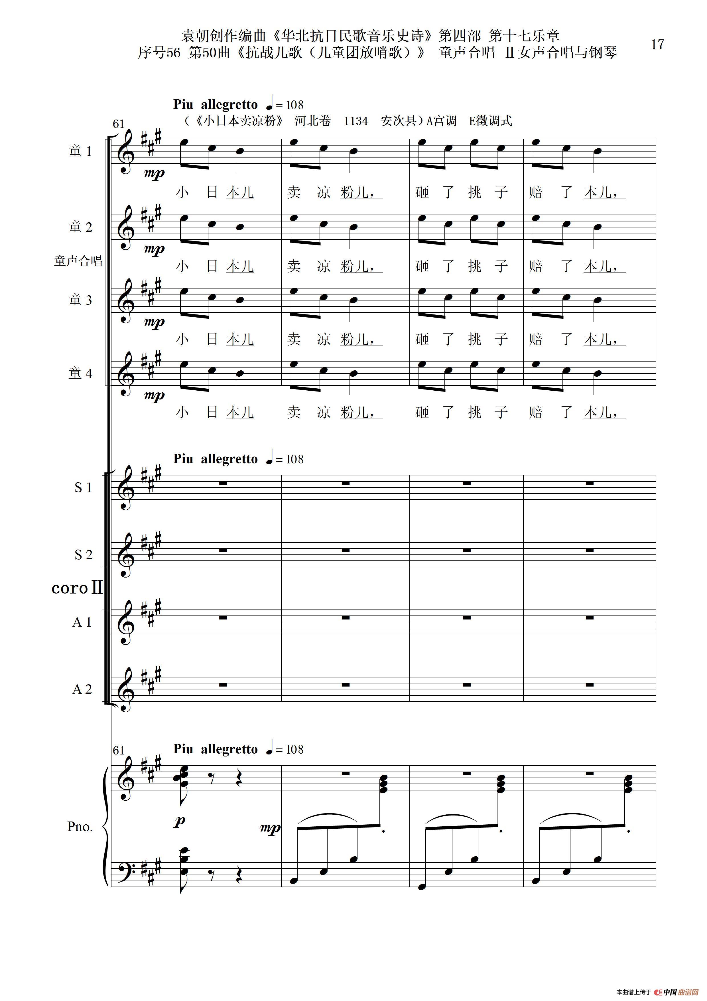 序号56第50曲《抗日儿歌(儿童团放哨歌)》童声合唱(或Ⅰ女声合唱代替)Ⅱ女声合唱与钢琴