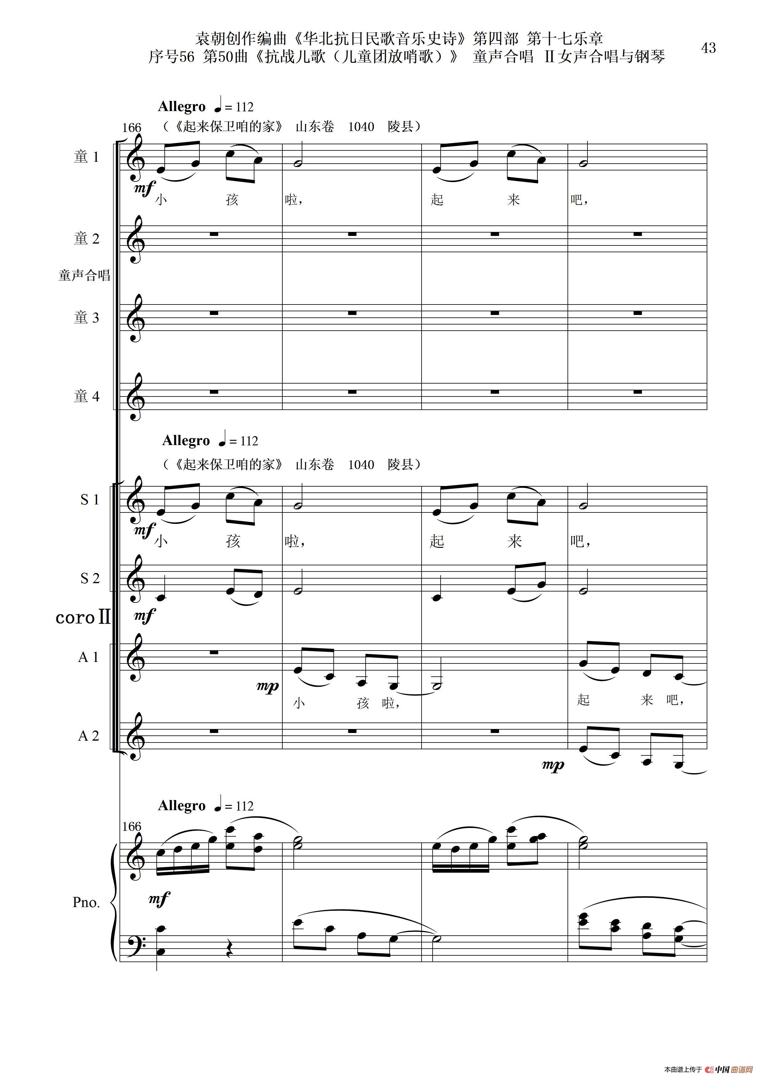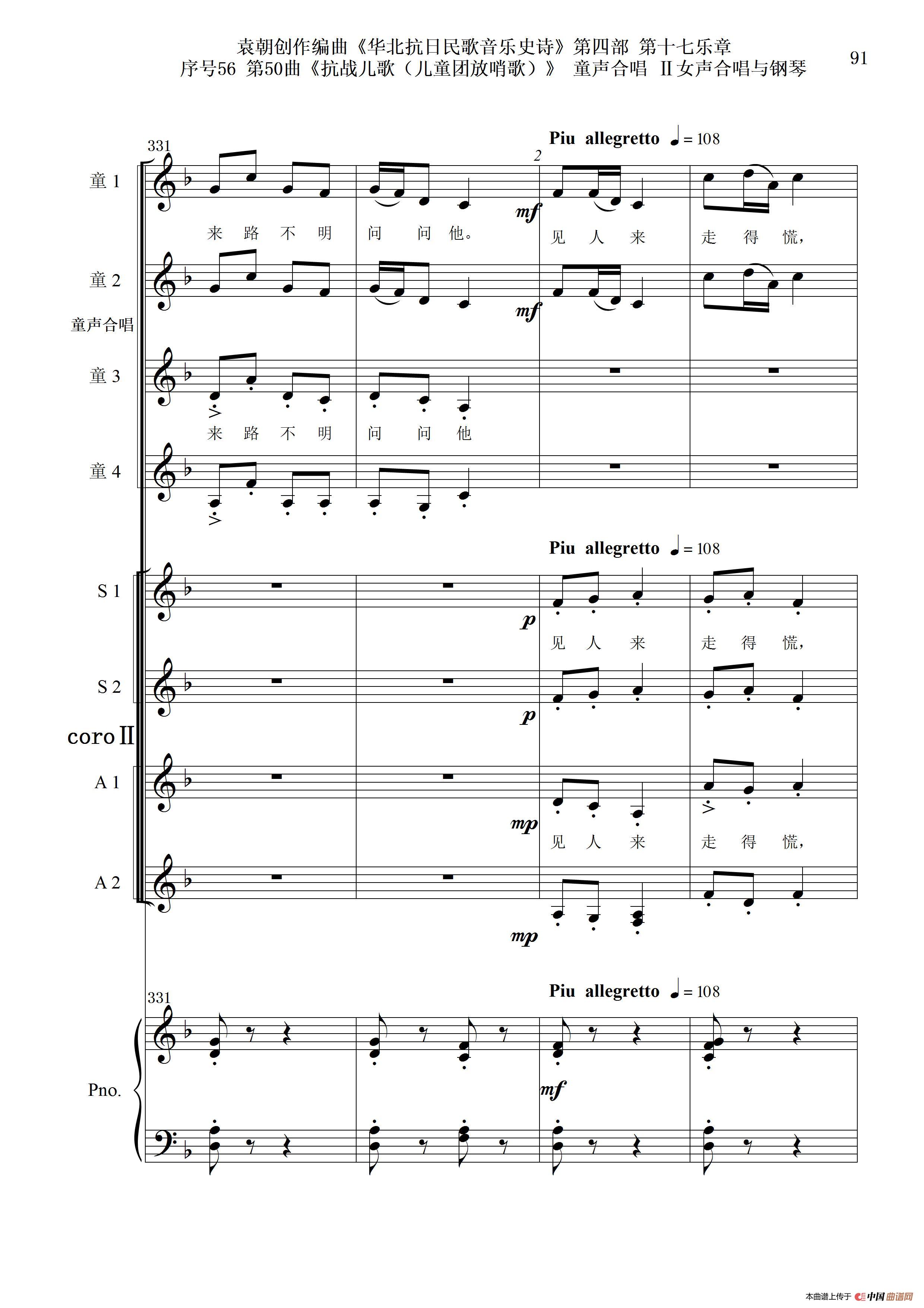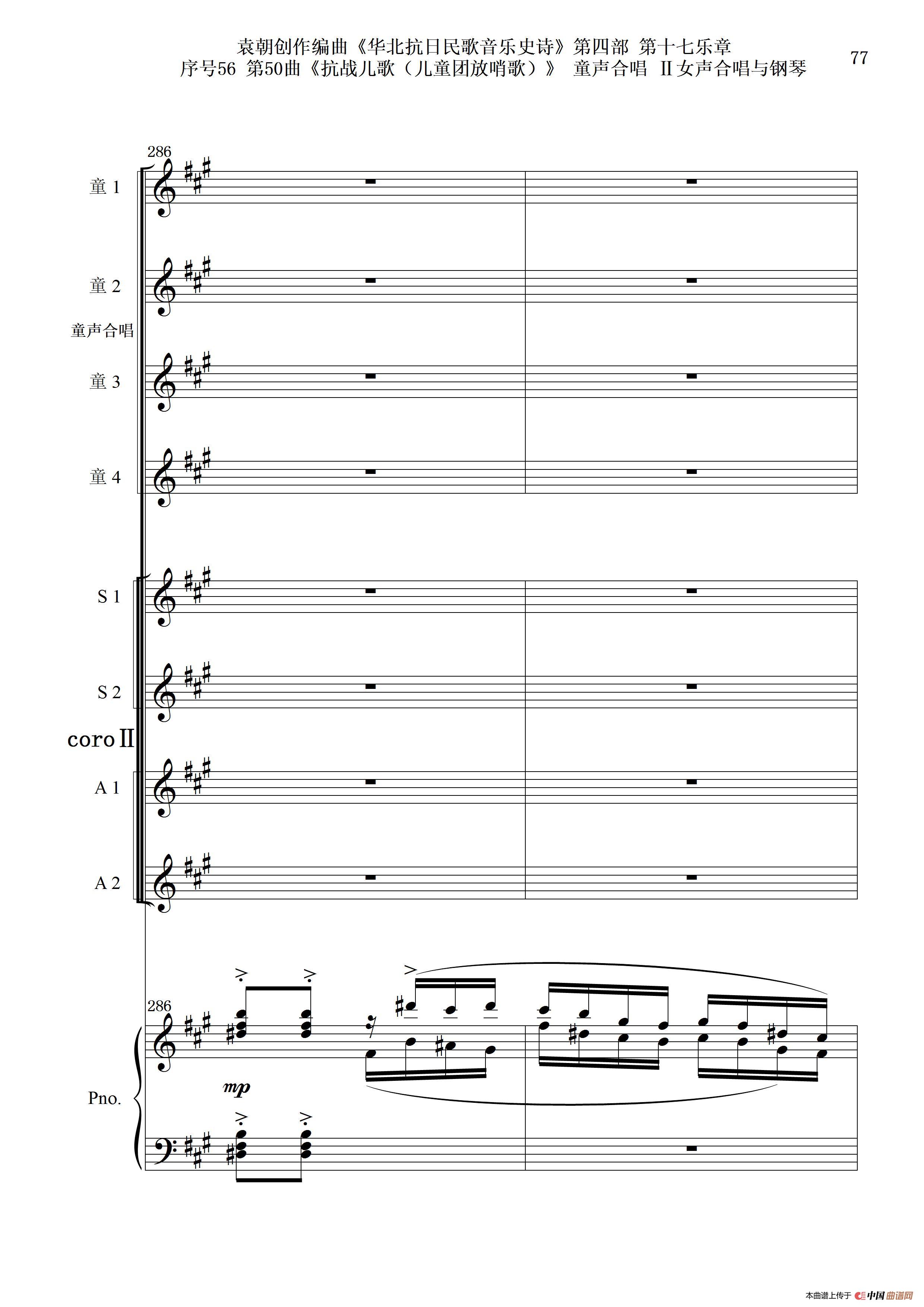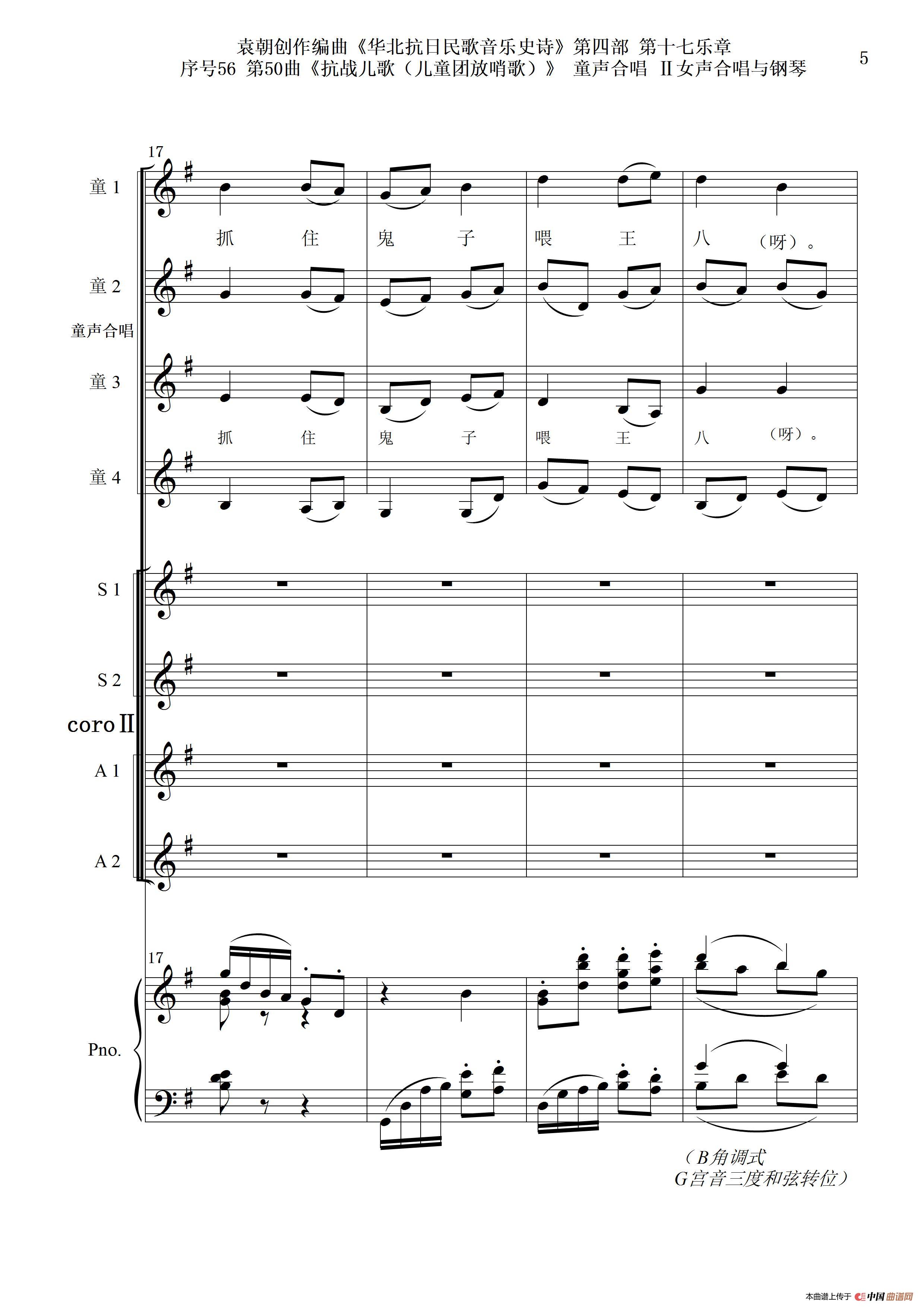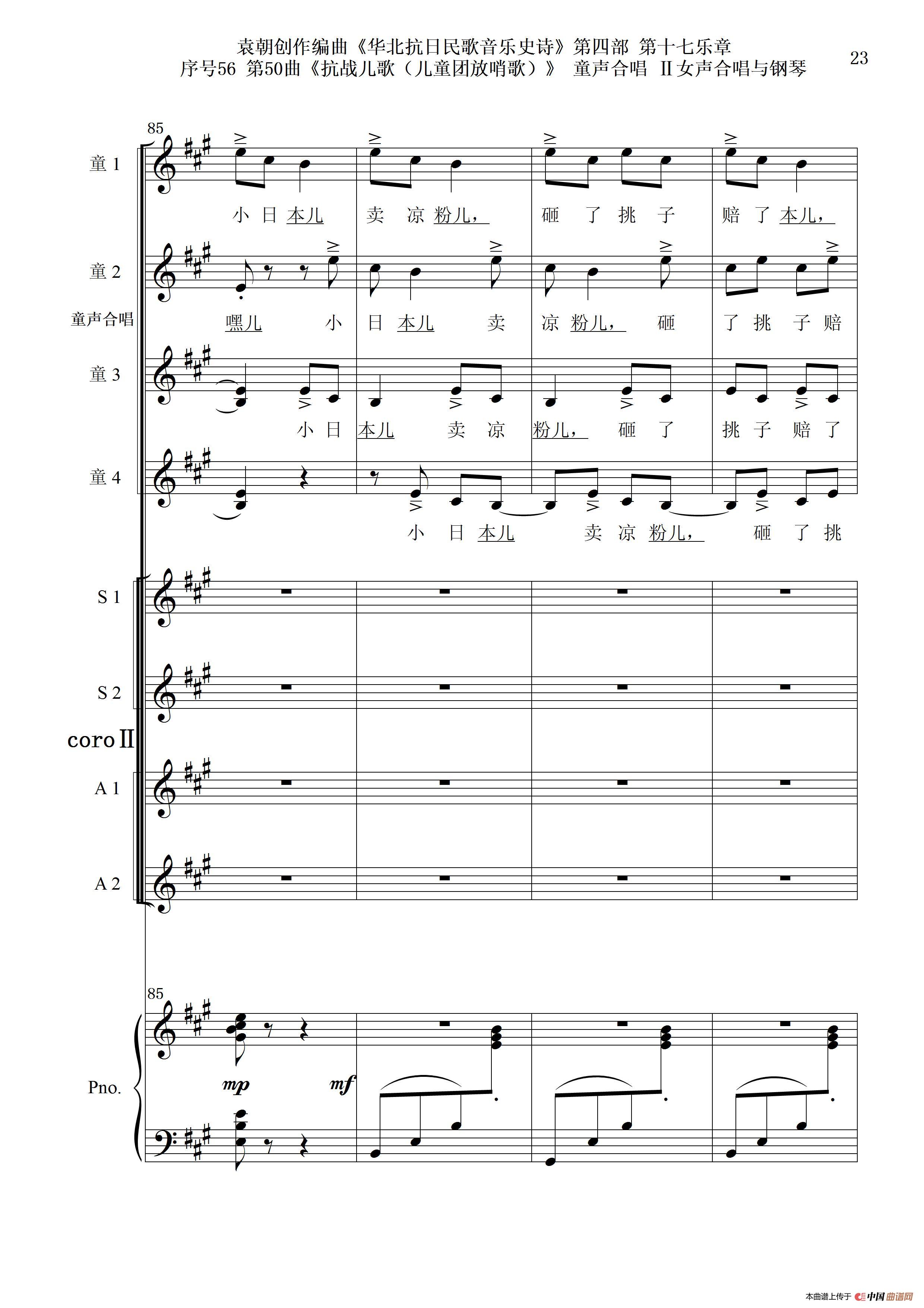 序号56第50曲《抗日儿歌(儿童团放哨歌)》童声合唱(或Ⅰ女声合唱代替)Ⅱ女声合唱与钢琴