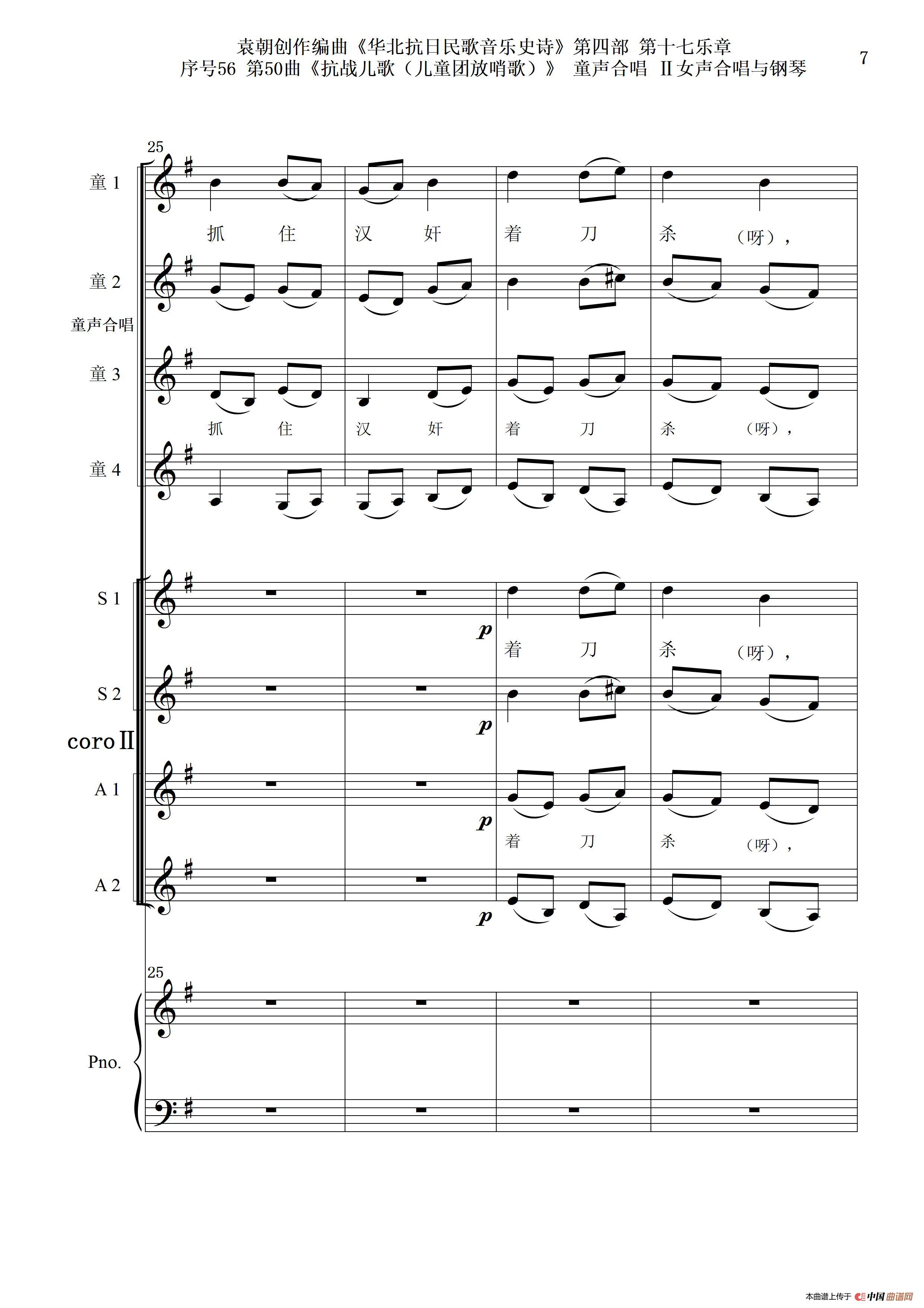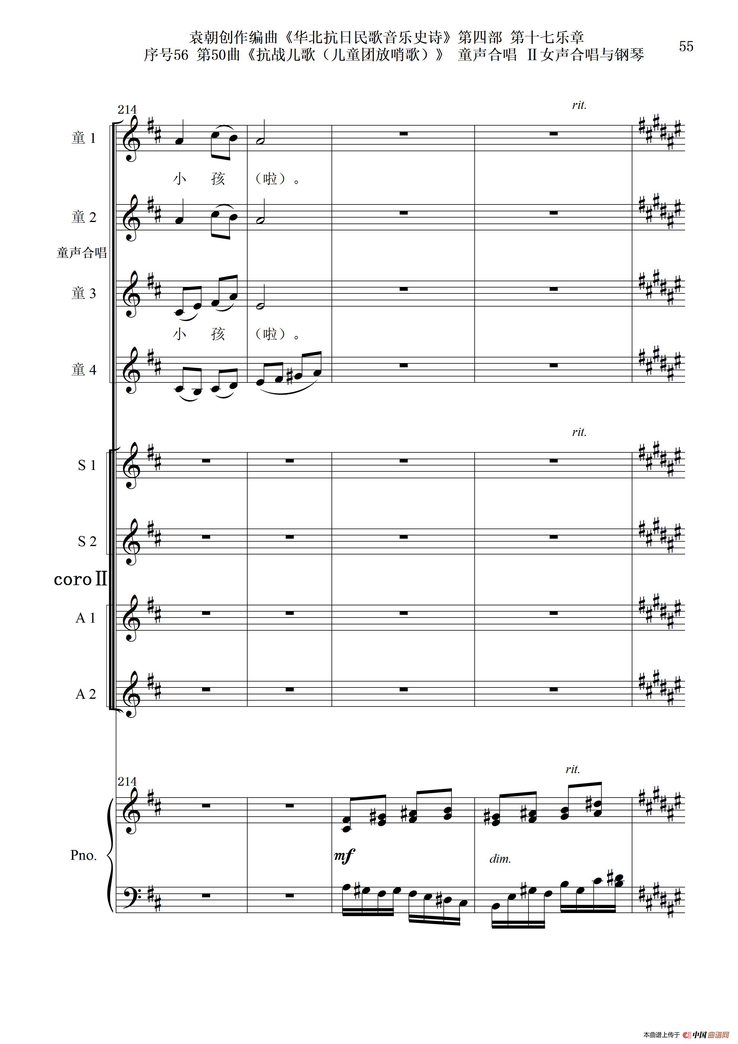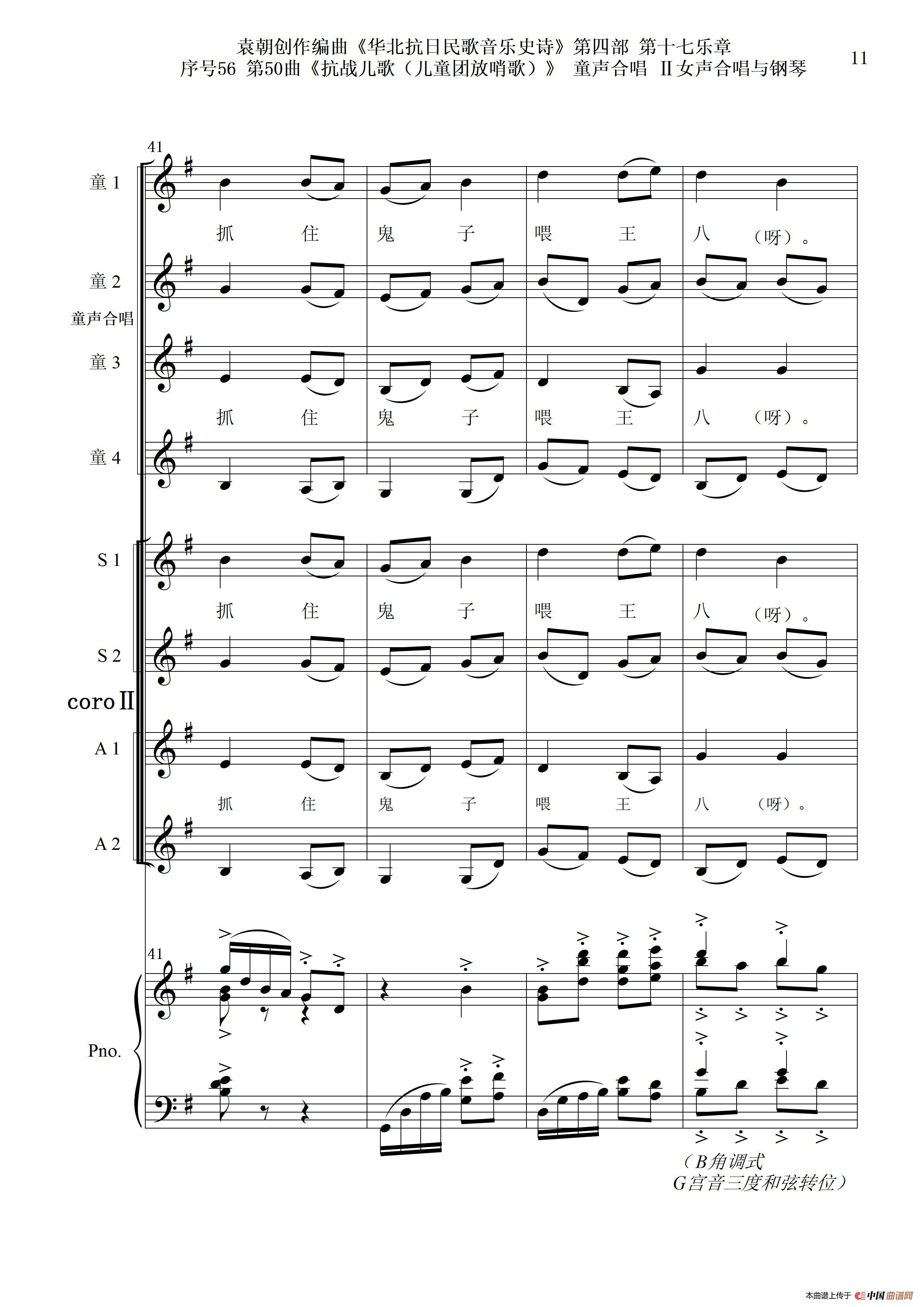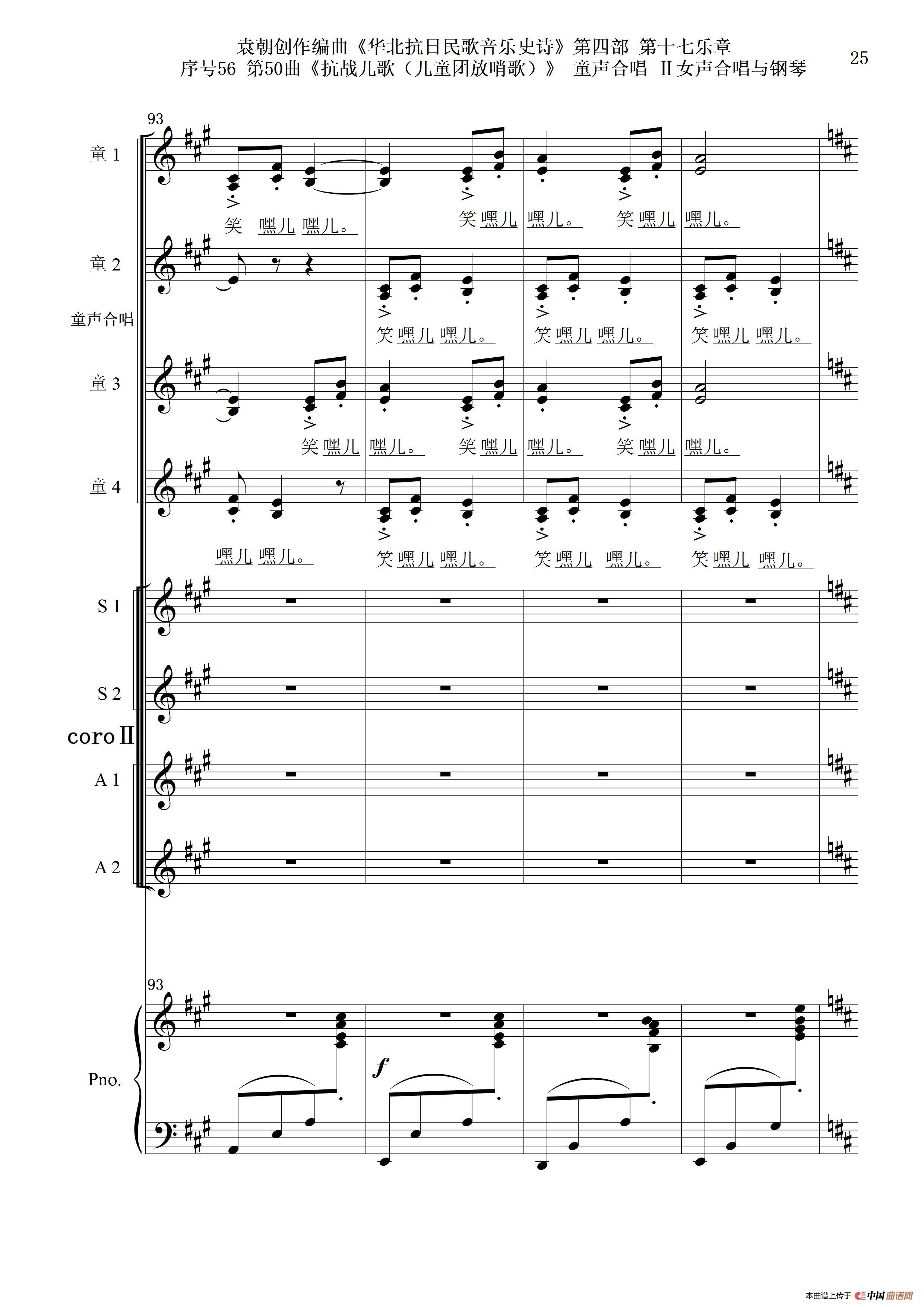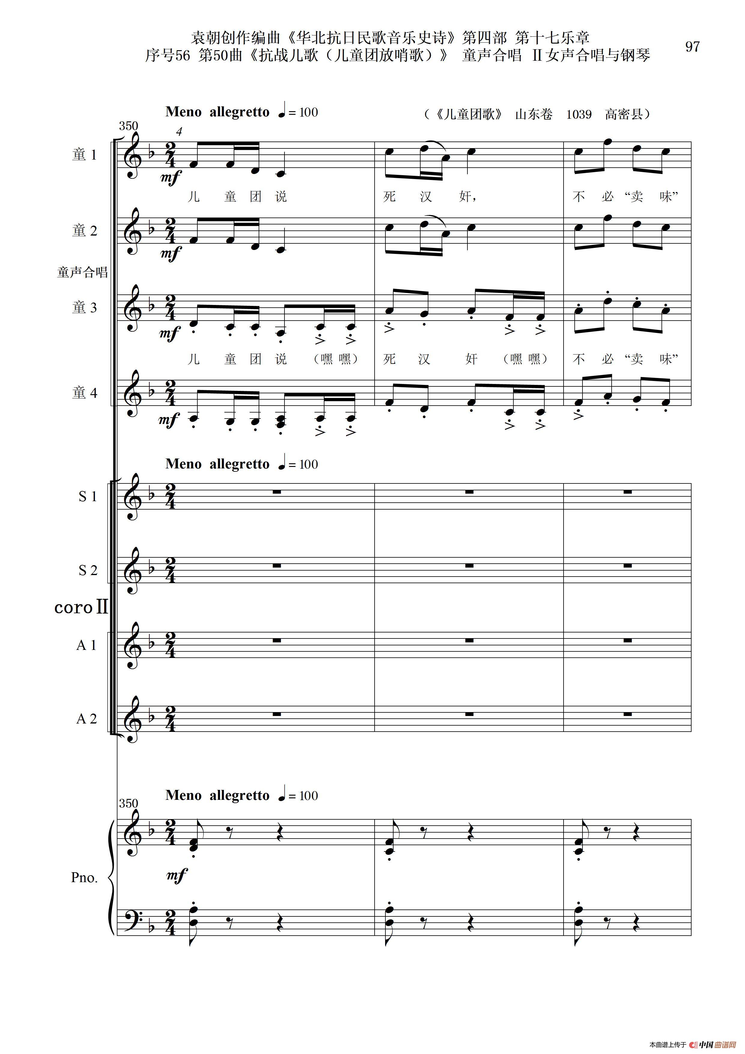 序号56第50曲《抗日儿歌(儿童团放哨歌)》童声合唱(或Ⅰ女声合唱代替)Ⅱ女声合唱与钢琴