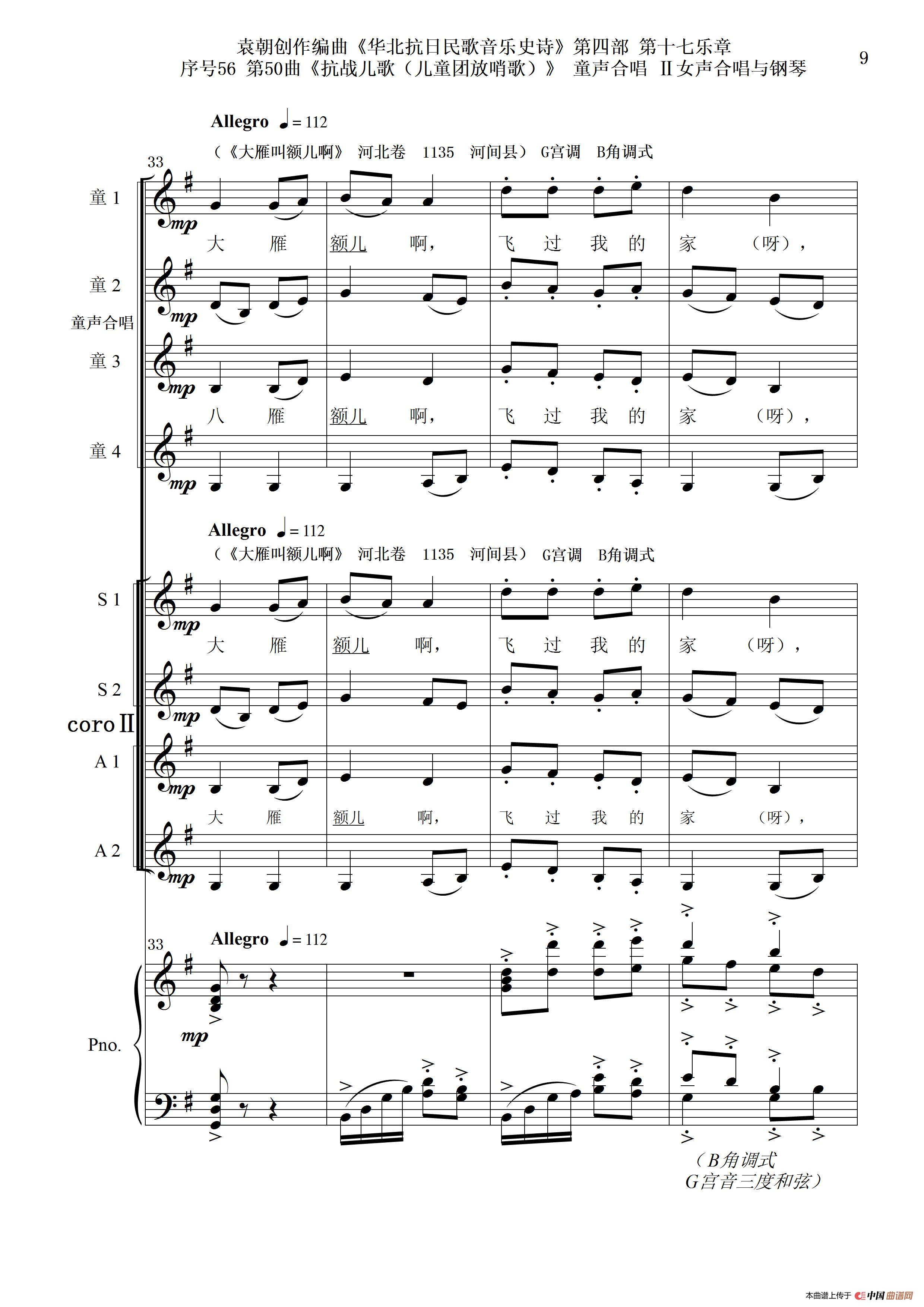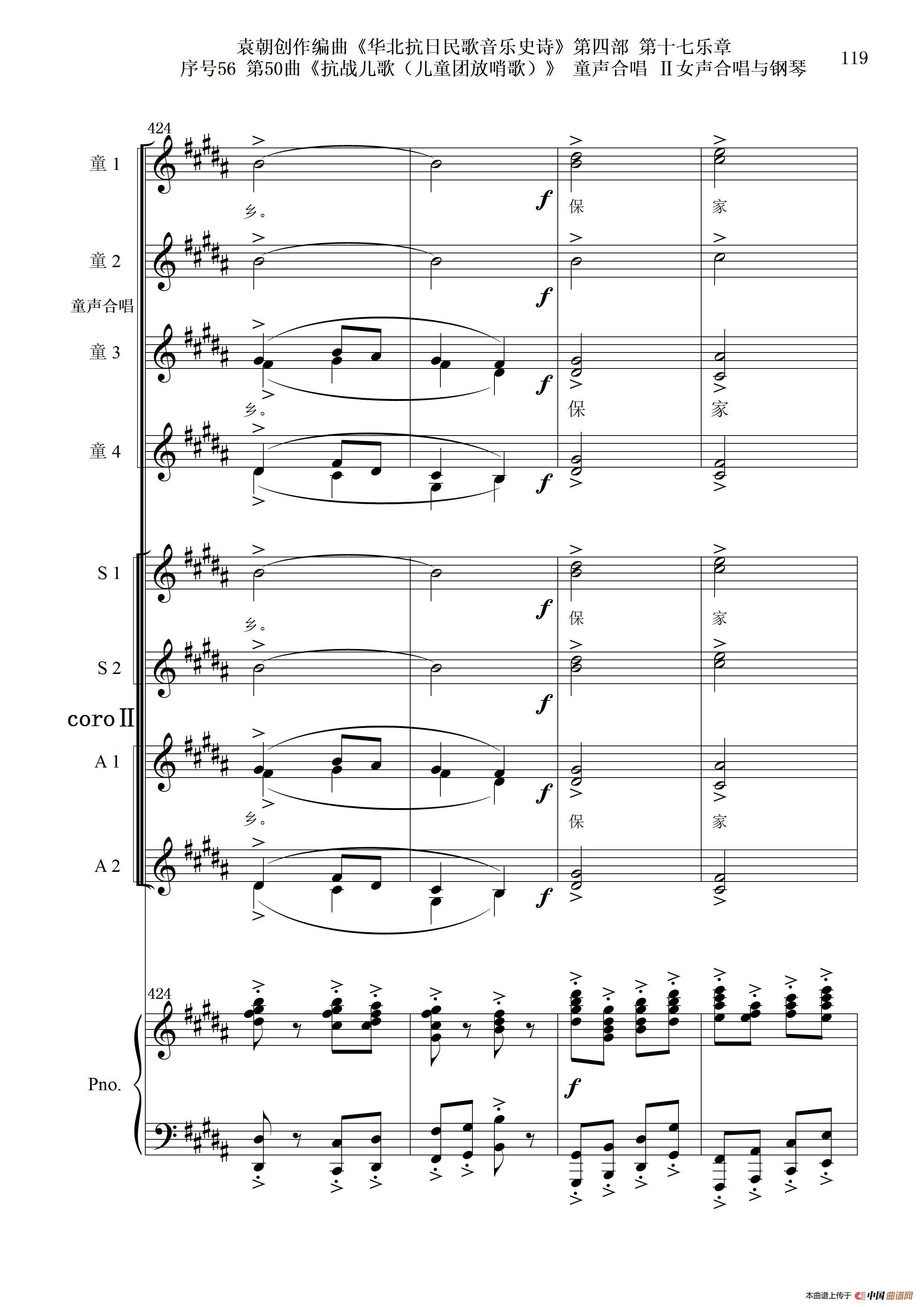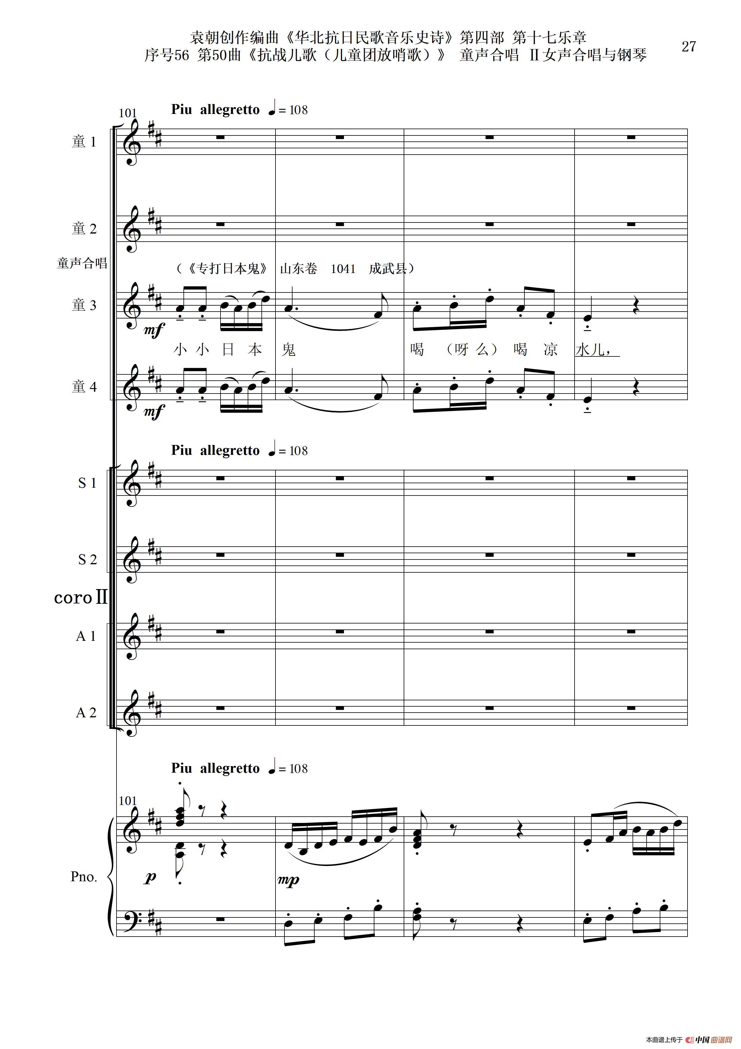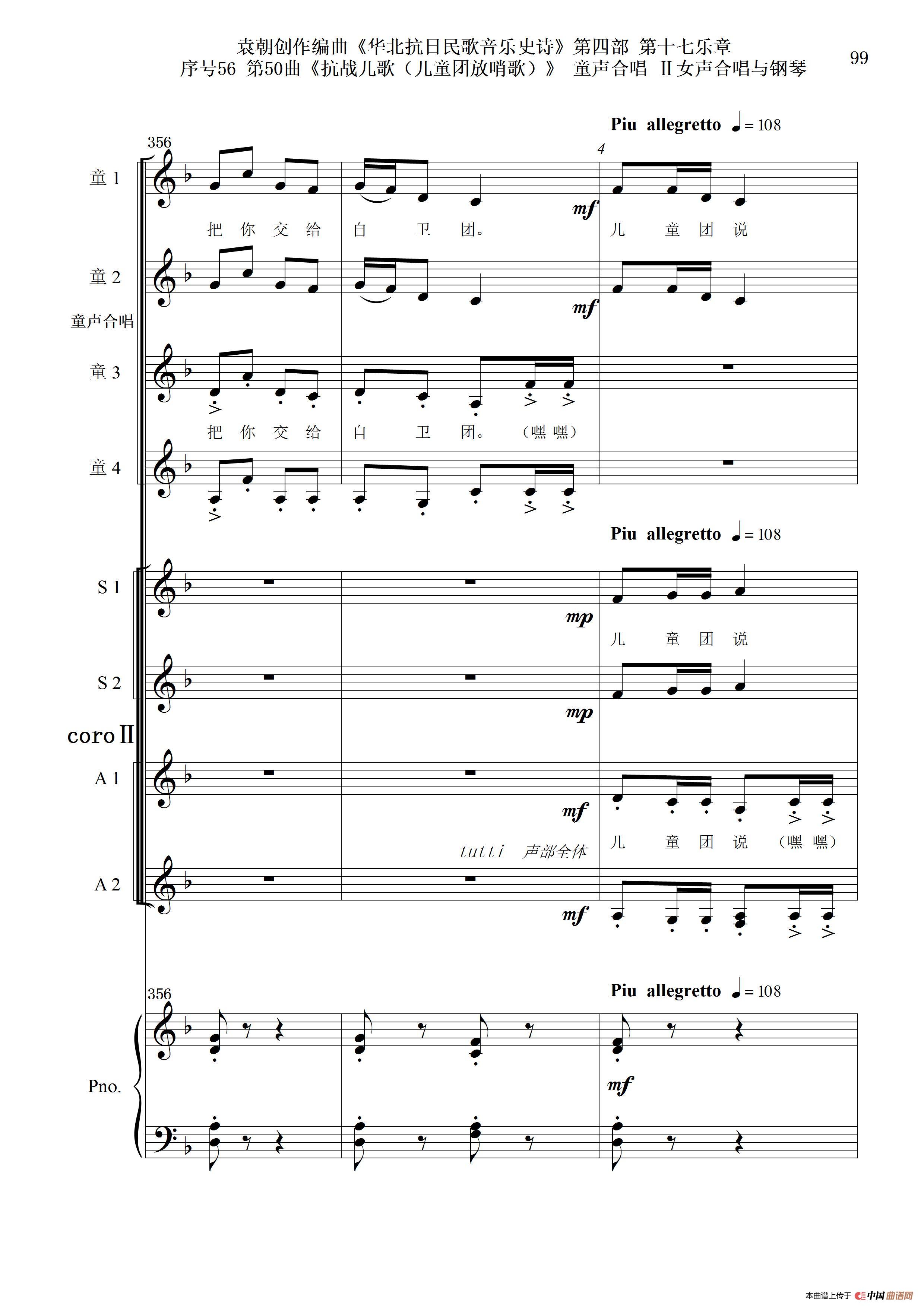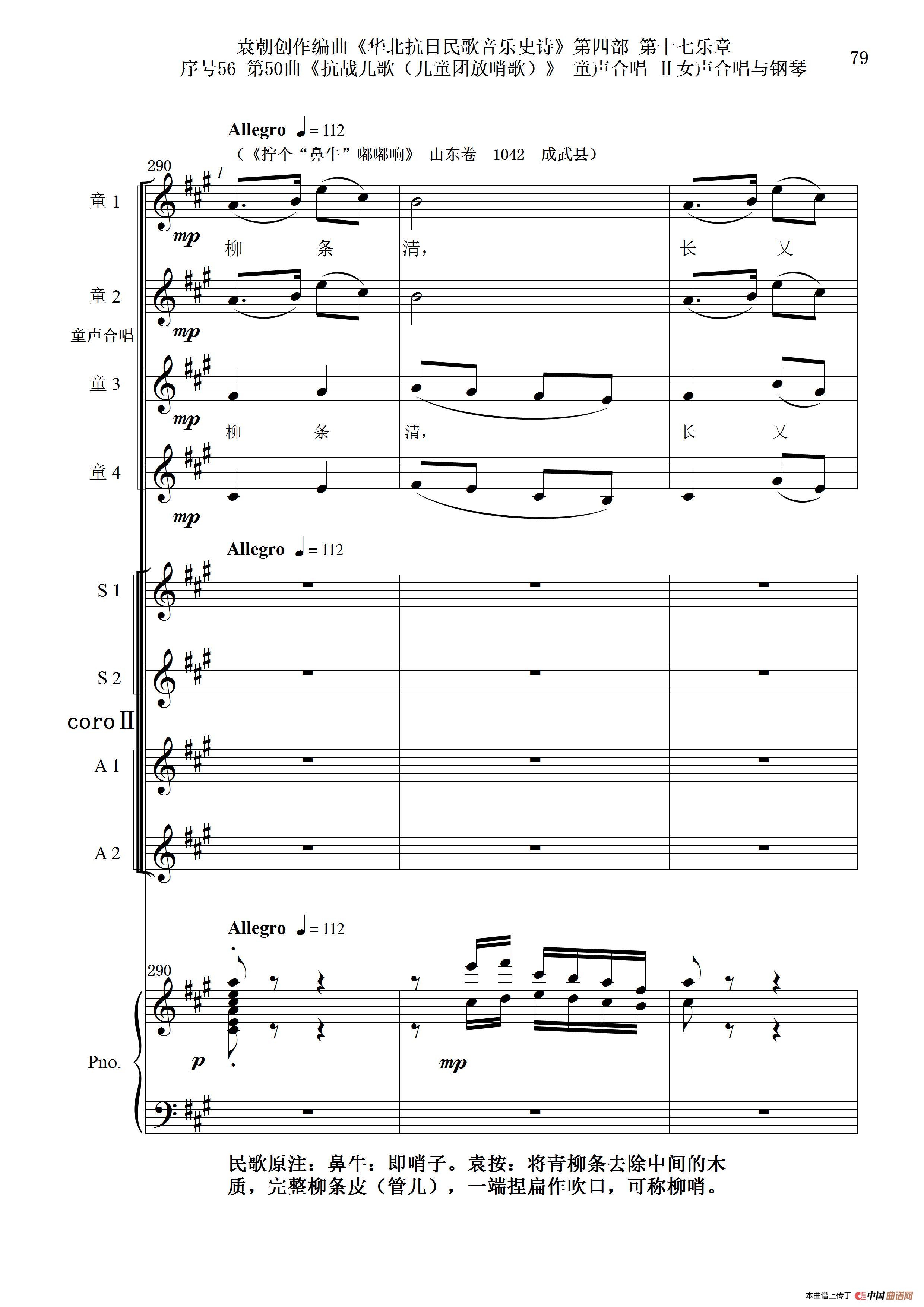 序号56第50曲《抗日儿歌(儿童团放哨歌)》童声合唱(或Ⅰ女声合唱代替)Ⅱ女声合唱与钢琴