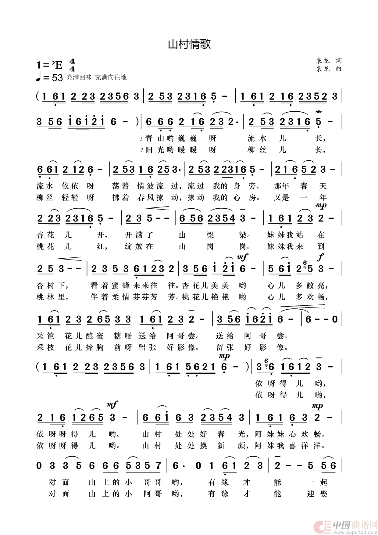 青山哟巍巍呀流水儿长,流水依依呀荡着情波流过我的身旁。那年春天杏花儿开,开满了山梁梁。对面山上的小阿哥哟,