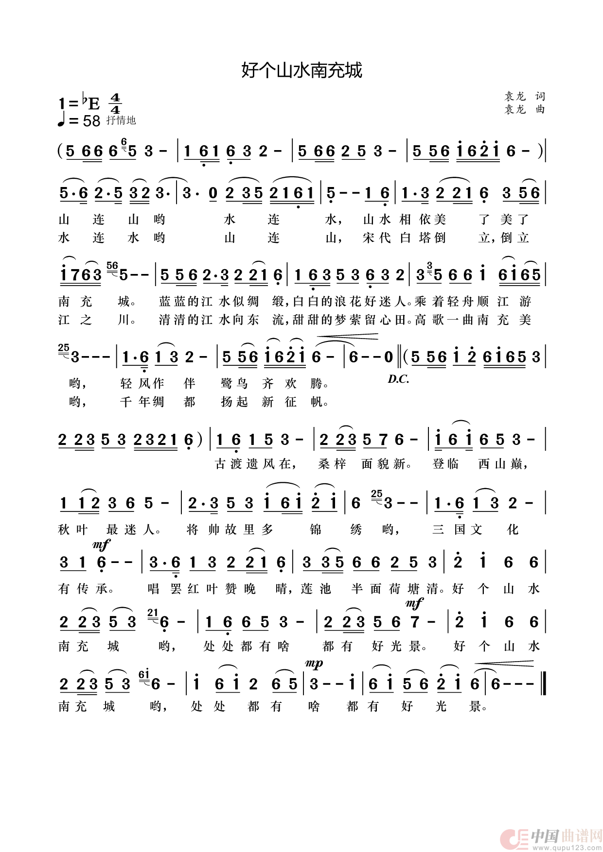 山连山哟水连水,山水相依美了,美了南充城。好个山水南充城哟,处处都有啥都有好光景。