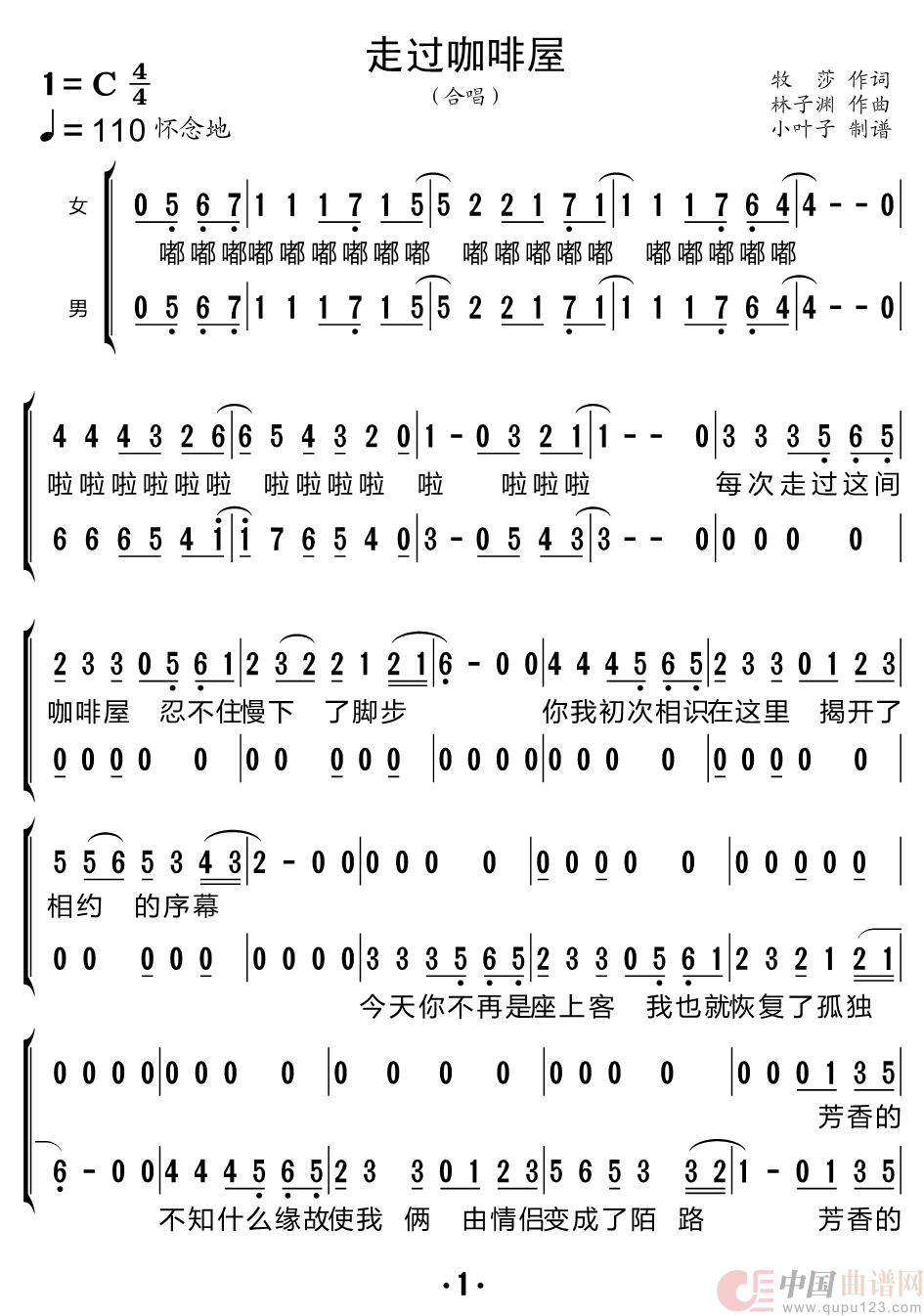 走过咖啡屋(二声部合唱简谱)