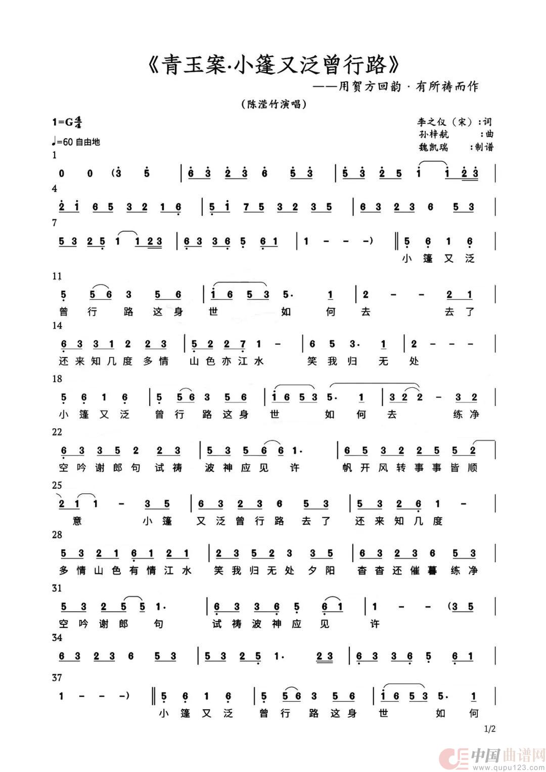 关于《青玉案.小篷又泛曾行路》曲谱的评论