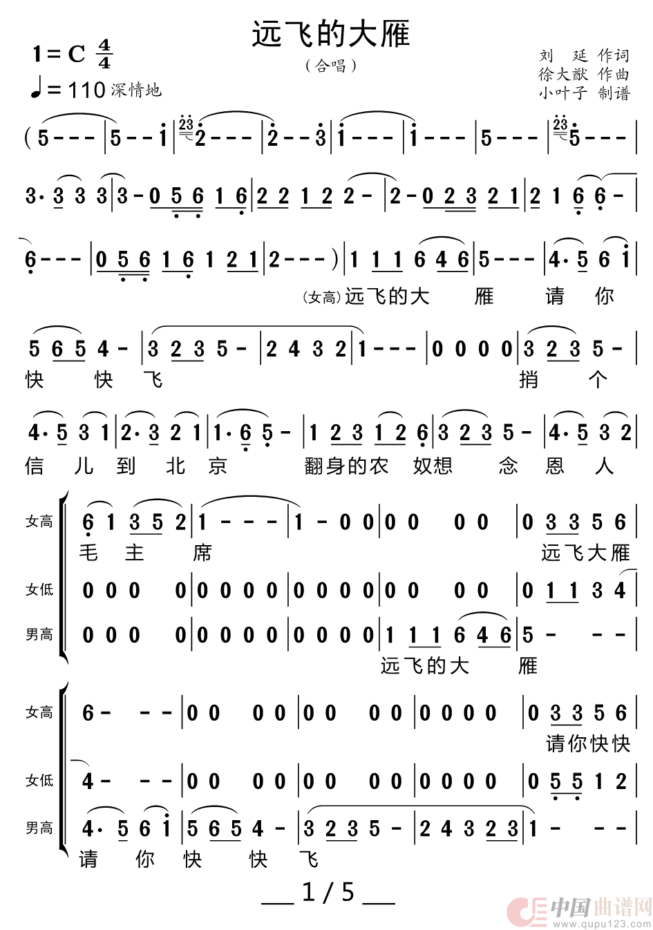 远飞的大雁(四声部合唱简谱)