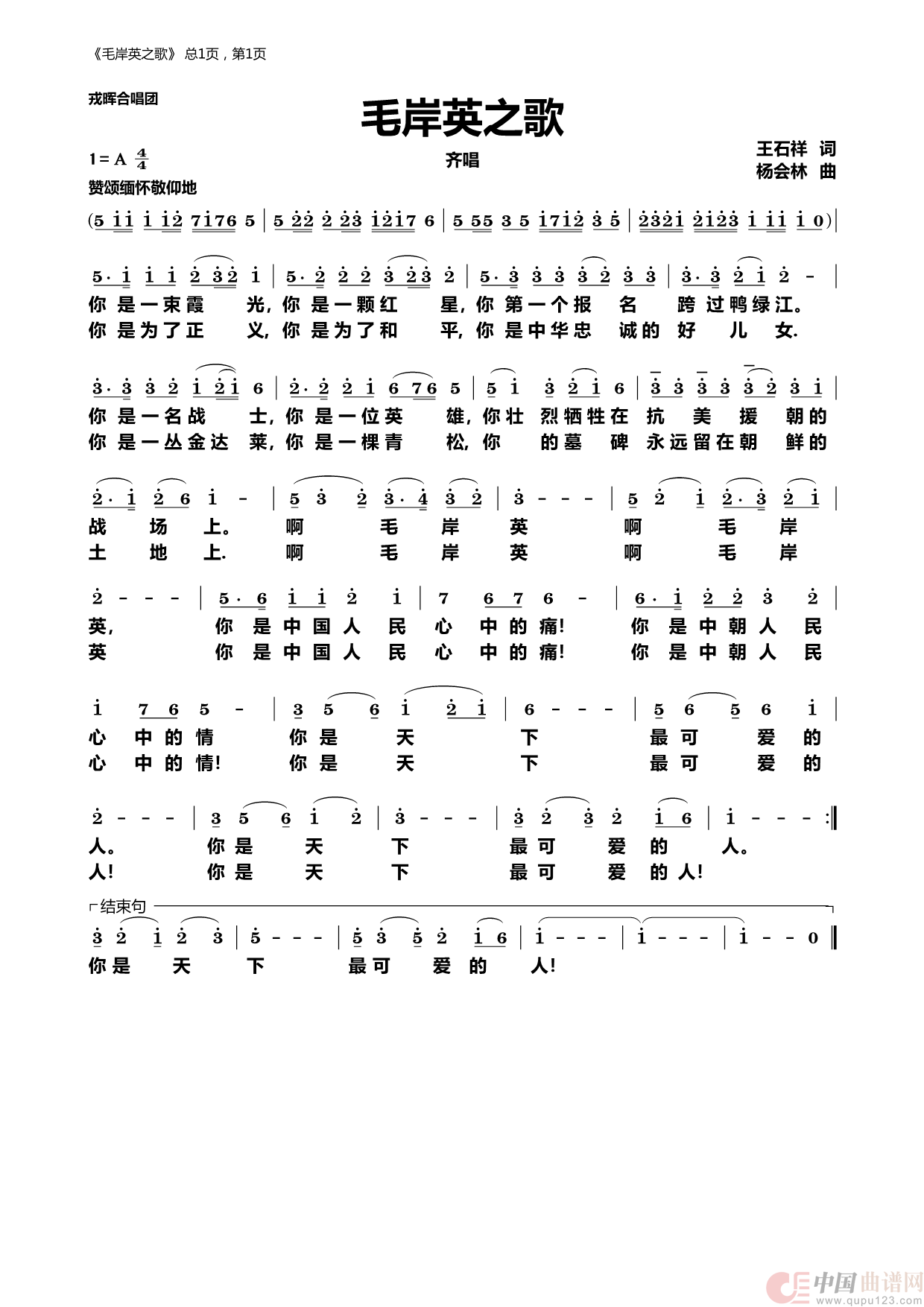 关于《毛岸英之歌》曲谱的评论