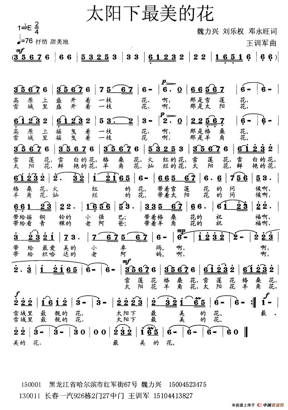 作词:魏力兴 刘乐权 邓永旺 作曲:王训军 演唱:孙俪心 编曲:大冰 混缩:沈林 高原上盛开着一枝花, 啊,那是雪莲花, 高原上摇曳着一枝花, 啊,那是格桑花。 雪莲花,雪白的花, 格桑花,火红的花, 雪莲花,雪白的花, 格桑花,火红的花。 带着雪莲花的问候啊, 带给摇铜铃的小强巴; 带着格桑花的祝福啊, 带给最爱美的小卓玛。 啊...... 雪莲花格桑花, 雪莲花格桑花, 高原上最靓的花, 太阳下最美的花。 雪域里盛开着一枝花, 啊,那是太阳花, 雪域里摇曳着一枝花, 啊,那是羊角花。 太阳花,鲜艳的花, 羊角花,灿烂的花, 太阳花,鲜艳的花, 羊角花,灿烂的花。 带着太阳花的问候啊, 带给看青稞的老阿爸; 带着羊角花的祝福啊, 带给织哈达的老阿妈。 啊...... 太阳花羊角花, 太阳花羊角花, 雪域里最靓的花, 太阳下最美的花。 |