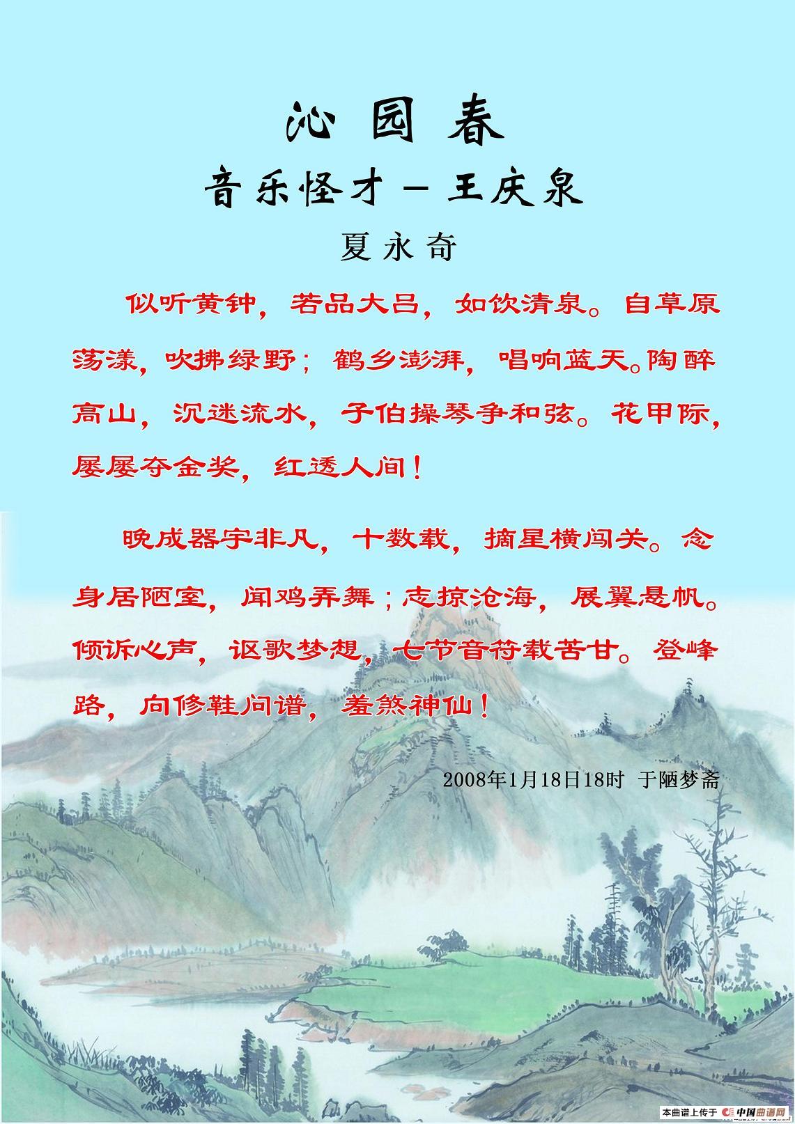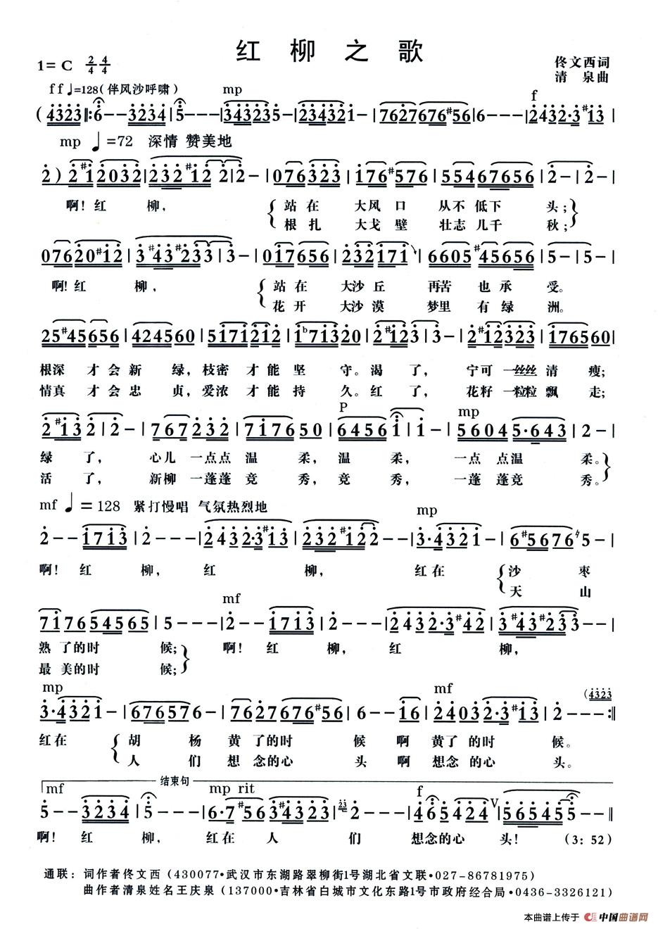 清泉新疆歌曲《红柳之歌》(佟文西词)是一首新疆风味赞颂红柳的艺术性歌曲,A+B单二部曲式。旋律高亢、挺拔、瑰丽,用美声风格演唱,当然也可以用民族风格演唱。采用民族调式与大小调式相结合的调式体系音阶,D商调式。歌颂红柳,实质上是歌颂人的一种精神。歌颂新疆各族人民,尤其是内地来的军垦战士及各界有志男女青年,扎根新疆建设新疆的那种顽强、坚韧、执着的精神。音频小样由曹廷编曲,声乐副教授李雪萍演唱。