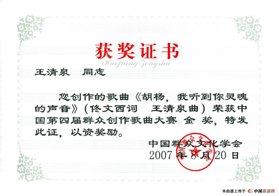 清泉新疆歌曲《胡杨,我听到你灵魂的声音》(佟文西词)是一首新疆风味赞颂胡杨的艺术性歌曲,ABC单三部曲式。旋律高亢、挺拔、瑰丽,用美声风格演唱,当然也可以用民族风格演唱。采用民族调式与大小调式相结合的调式体系音阶,D徵调式。有沙漠英雄树美誉的胡杨,生而不死一千年,死而不倒一千年,倒而不朽一千年。歌颂胡杨,就是歌颂新疆各族人民,尤其是内地来的军垦战士及各界有志男女青年,扎根新疆建设新疆的那种顽强、坚韧、执着的精神。音频小样由曹廷编曲,陈浩亮演唱。