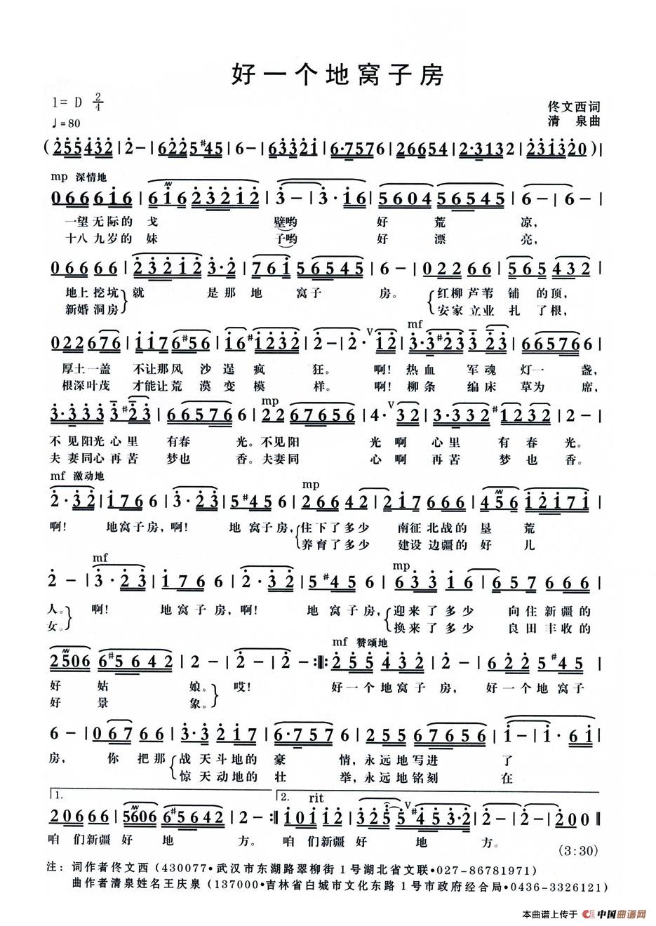 清泉新疆歌曲《好一个地窝子房》(佟文西词)是一首歌颂新疆生产建设兵团的艺术性歌曲,商调式,无再现的单三部曲式,适宜美声或民族风格演唱。在20世纪50年代,为响应国家号召,一批批山东、河南、四川及上海、南京、天津、武汉等地的姑娘登上西去的列车,到新疆实现报国志,其中就有“八千湘女进天山”的动人场面。这些姑娘到新疆参加军垦建设,后与军垦战士结姻缘,将青春献给了兵团的屯垦事业。这首歌曲就是屯垦初期艰苦创业的真实写照,情感凝重、感人肺腑。唱起它对老年人是一种回忆,对年轻人是一种继承,我们不能忘记中国人民解放军的这段“战天斗地的豪情”、“惊天动地的壮举”。音频小样由朱清彦编曲,蒋艳琦 朱清彦对唱。