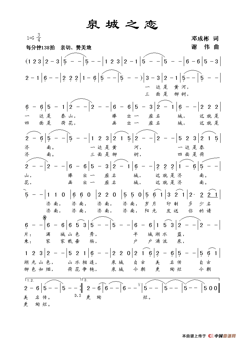 (邓成彬词 谢伟曲编 朱跃明唱) 一边是黄河, 一边是泰山, 捧出一座名城, 这就是济南。 济南,济南, 岁月印制多少名片: 满城山色秀, 半城湖水蓝, 湖光山色,山水相连, 泉城自古美名传。 三面是柳树, 四面是荷花, 画出一座名城, 这就是济南。 济南,济南, 阳光发送你的请柬: 家家栽垂柳, 户户涌流泉, 柳色如烟,荷花争艳, 泉城今朝更绚烂。 |