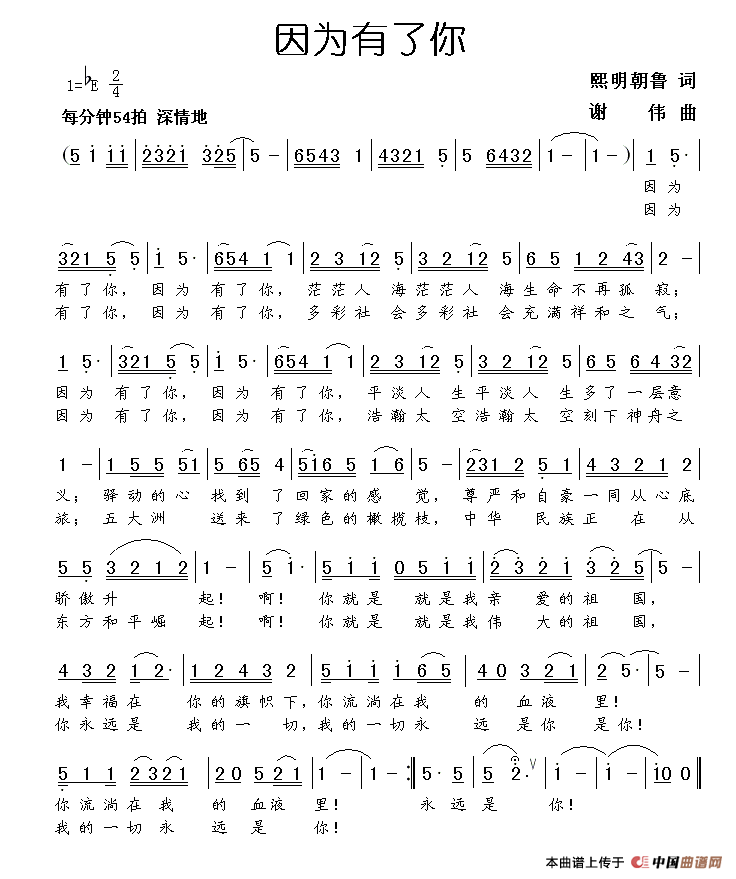 茫茫人海生命不再孤寂; 因为有了你, 平淡人生多了一层意义; 驿动的心找到了回家的感觉, 尊严和自豪一同从心底骄傲升起! 啊!你就是我亲爱的祖国, 我幸福在你的旗帜下, 你流淌在我的血液里! 因为有了你, 多彩社会充满祥和之气; 因为有了你, 浩瀚太空刻下神舟之旅; 五大洲送来了绿色的橄榄枝, 中华民族正在从东方和平崛起! 啊!你就是我亲爱的祖国, 你永远是我的一切, 我的一切永远是你! |