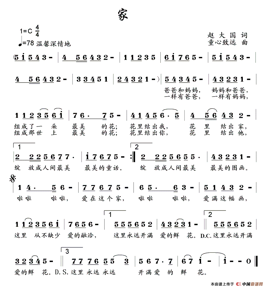 作词 赵 大 国 作曲 童心致远 演唱 黄 诗 佳(首唱) 爸爸和妈妈, 妈妈和爸爸, 组成了一朵最美的花; 花里结出我, 花里结出家, 绽放成人间最美的童话! 一样有爸爸, 一样有妈妈, 组成那世上最美的花; 花里结出你, 花里结出他, 绽放成人间最美的图画! 啦啦啦,爱在这个家, 啦啦啦,爱满这幅画, 这里从不缺少爱的融洽; 啦啦啦,就爱这个家, 啦啦啦,就爱这幅画, 这里永远开满爱的鲜花! |