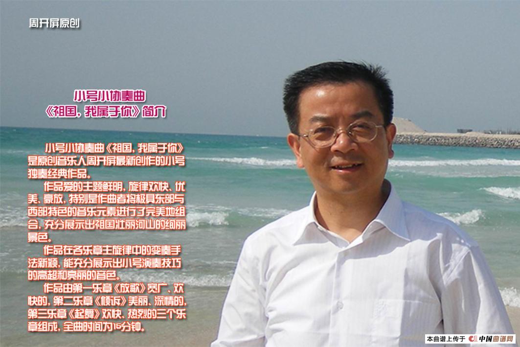 周开屏原创小号小协奏曲《祖国,我属于你》在中国曲谱网首发,该作品爱的主题鲜明,旋律欢快、优美、豪放,是我国原创小号演奏的经典作品。作品完美地展示出祖国壮丽河山的绚丽景色和小号高超的演奏技巧。全曲时间为15分钟。