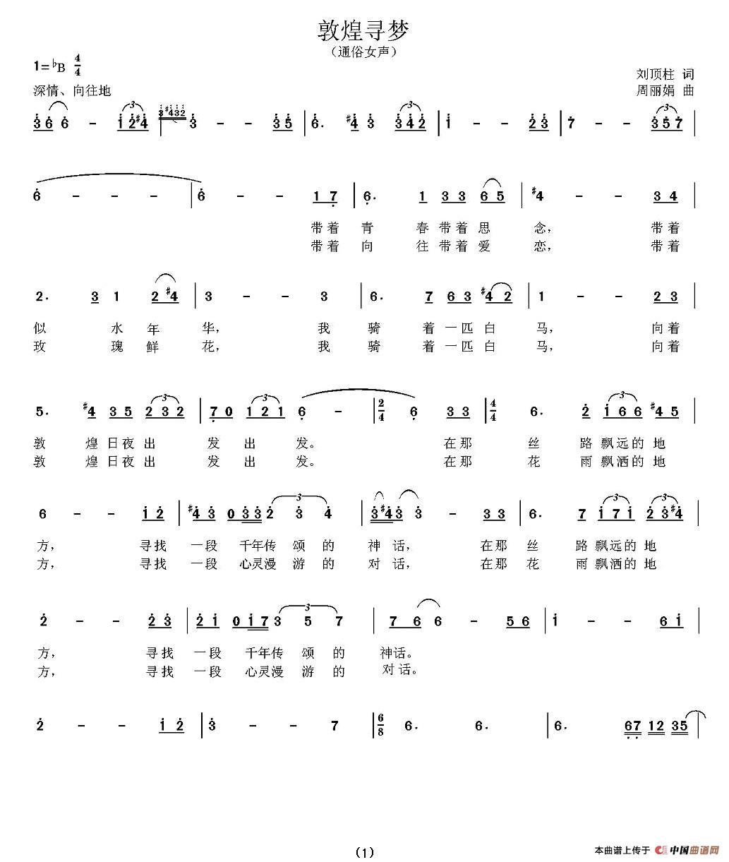 作词:刘顶柱 作曲:周丽娟 演唱:戴海霞 编曲:连建西 后期:芳斌音乐工作室 带着青春 带着思念 带着似水年华 我骑着一匹白马 向着敦煌日夜出发 在那丝路 飘远的地方 寻找一段 千年传颂的神话 一曲神韵 幽幽怨怨 飘飘洒洒 荒凉古堡中 是谁在反弹着琵琶 带着向往 带着爱恋 带着玫瑰鲜花 我骑着一匹白马 向着敦煌日夜出发 在那花雨 飘洒的地方 寻找一段 心灵漫游的对话 裙裾飘曳 临风欲飞 如虹如霞 大漠孤烟里 是谁在飞扬着长发 啊 忘了收藏 啊 如风如沙 千年相思 如水月光里 是谁的爱恋 在发芽 啦啦啦……啦啦啦…… 啦啦啦……啦啦啦…… |