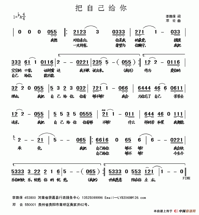 作词:李荫保 作曲:邓云 编曲:邓 云 演唱:邓云 我想对你表白, 你是我的最爱, 摸摸空空的口袋, 话到嘴边我不敢说出来。 我还一无所有, 奢望与你厮守, 我把自己给你, 能不能作为爱你的理由。 我把自己给你你看够不够, 我会为你忘了自己苦苦去追求; 我把自己给你你看够不够, 什么样的苦和累我都能承受。 我把自己给你够不够, 我会快乐你的快乐忧愁你的忧愁, 我把自己给你够不够, 今生今世我愿意陪在你左右! |