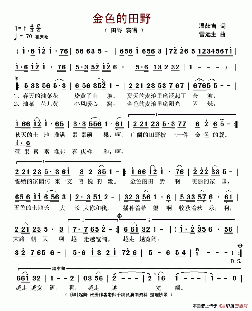 作词:温喆吉 作曲:雷远生 演唱:田 野