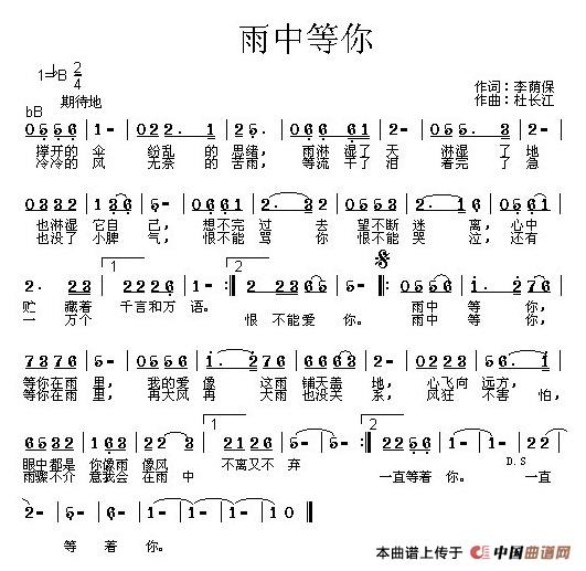 作词:李荫保 作曲:杜长江 编曲:晨晖 演唱:胡梅 撑开的伞纷乱的思绪, 雨淋湿了天淋湿了地也淋湿它自己, 想不完过去望不断迷离, 心中贮藏着千言和万语。 冷冷的风无奈的苦雨, 等流干了泪着完了急也没了小脾气, 恨不能骂你恨不能哭泣, 还有一万个恨不能爱你。 雨中等你,等你在雨里, 我的爱像这雨铺天盖地, 心飞向远方,眼中都是你, 像雨像风不离又不弃。 雨中等你,等你在雨里, 再大风再大雨也没关系, 风狂不害怕,雨骤不介意, 我会在雨中一直等着你。 |