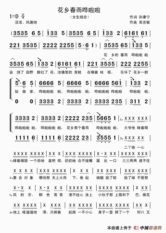 关于《花乡春雨哗啦啦(女声组合 孙康宁词 吴克敏曲)》曲谱的评论