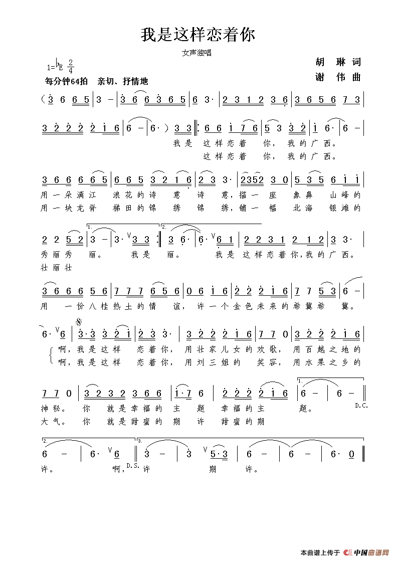 作词:胡琳   作曲:谢伟   来源:谱友谢伟上传   上传:谢伟   日期:2013-12-31   浏览次数: